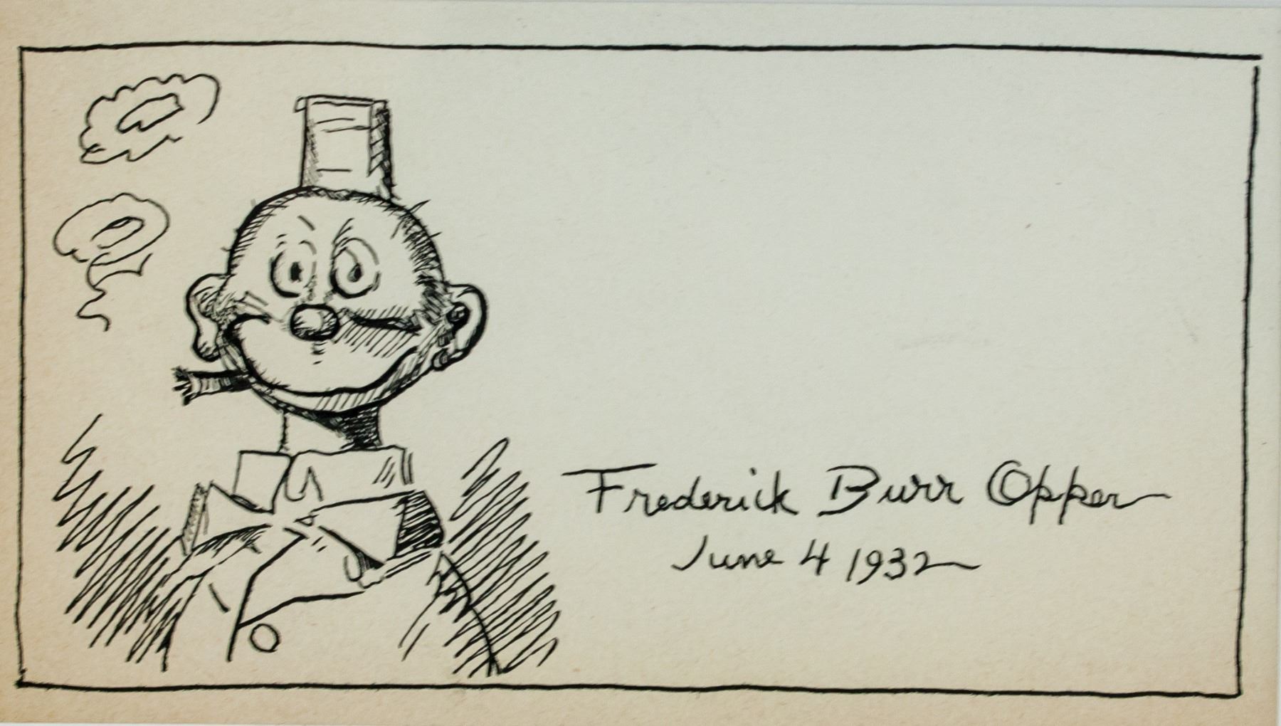 Ink on paper, framed. Featuring a portrait. Signed Ferderick Burr Opper on the lower right corner and inscribed June 4 1932. Inscribed 1932 in pencil on lower right corner, verso. Attributed to Frederick Burr Opper (1857-1937, American). 9 x 16 cm (3.5 x 6.3 inches). Frame size: 19.5 x 24.5 cm (7.7 x 9.6 inches). PROVENANCE: Southern Ontario estate