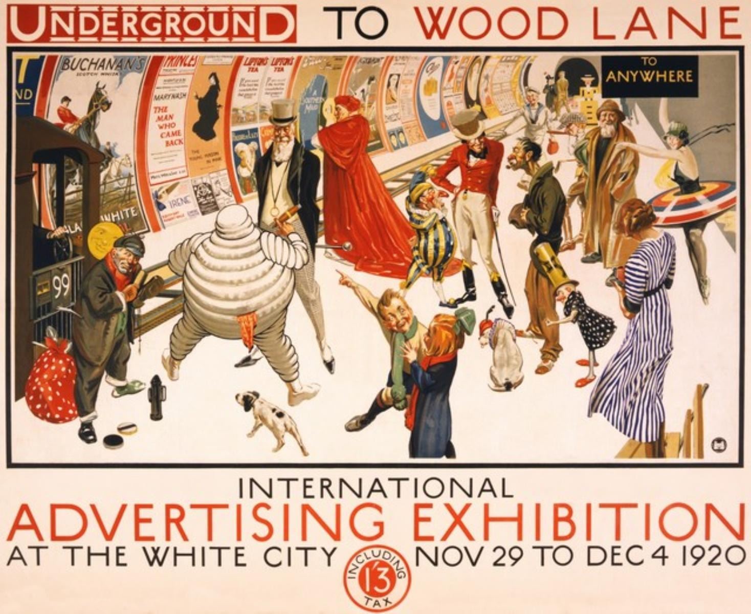 Artist: Frederick Charles Herrick - Title: Underground to Wood Lane to Anywhere - Medium: Fine Art Giclee on Canvas - Image Size: Approximately 26 inches x 32 inches - Unframed on Unstretched Canvas - Underground to Wood Lane to anywhere: International Advertising Exhibition at the White City, November 29 to December 4, 1920. Advertising poster for subway transportation to an exhibition at White City, London, showing an assemblage of characters representing various advertising trademarks and emblems, including Bibendum, the Michelin Man; Johnnie Walker; and the Kodak Girl, in a subway station displaying advertising posters.