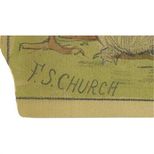 <B>Frederick Church: 1876 Signed Watercolor.</B></I> Signed: <I>F.S. Church,</B></I> one page, 11.75" x 8.5", pen, ink, and watercolor, np, 1876. This watercolor features the American eagle dressed in red, white, and blue. It was likely done for the 1876 Centennial, it is titled <I>The American Eagle 'Putting On The Style',</B></I> and shows him dressed like Uncle Sam. In fine condition; probably done as a magazine illustration; moderate edge wear; paper is slightly brittle and yellowed; lower left corner is missing.