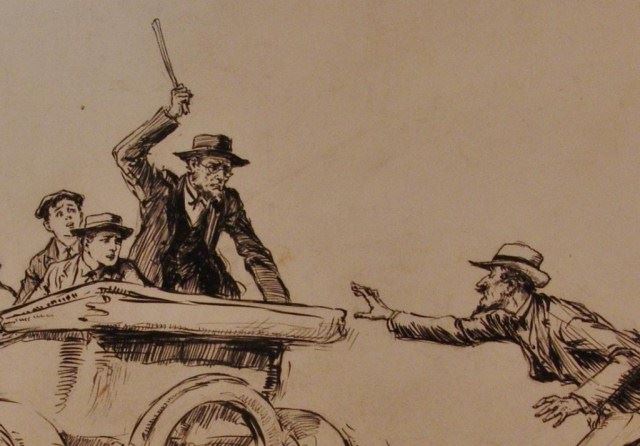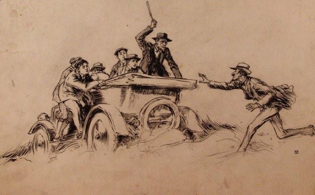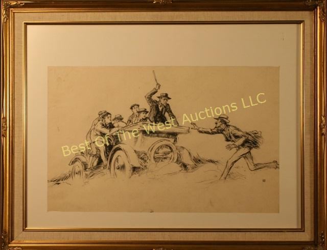 "A Getaway", men in car with man chasing them down, 12" x 19", sight, monogram lower right, nice frame, -562196-D