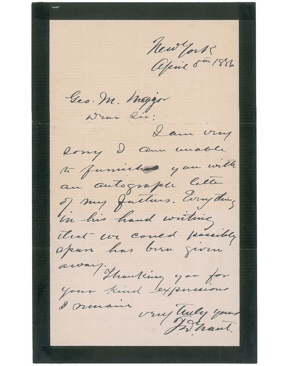 First son of President U. S. Grant (1850–1912) who graduated from West Point in 1871 and served in the Indian Wars, Spanish-American War, and Philippine-American War. ALS signed “F. D. Grant,” one page, 5 x 8, April 5, 1886. Response to an autograph request. In part: “I am very sorry I am unable to furnish you with an autograph of my father’s. Everything in his hand writing that we could possibly spare has been given away.” In fine condition, with a stray ink blot to one word.
