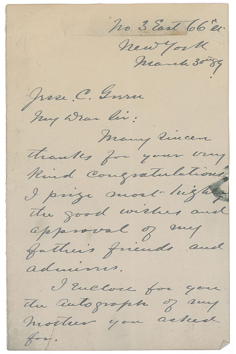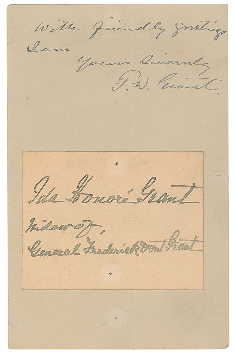 First son of President U. S. Grant (1850–1912) who graduated from West Point in 1871 and served in the Indian Wars, Spanish-American War, and Philippine-American War; he married married Ida Marie Honore in 1874. ALS signed “F. D. Grant,” two pages, 4.5 x 7, March 30, 1889. Letter to a gentleman. In part: “I prize most highly the good wishes and approval of my father’s friends and admirers.” Affixed to the bottom of the letter is an ink signature, “Ida Honore Grant, widow of, General Frederick Dent Grant,” on an off-white 3.5 x 2.75 card. Central vertical and horizontal folds (the vertical fold passing through a single letter of the signature), light scattered toning and soiling, and a few tack holes, otherwise fine condition.