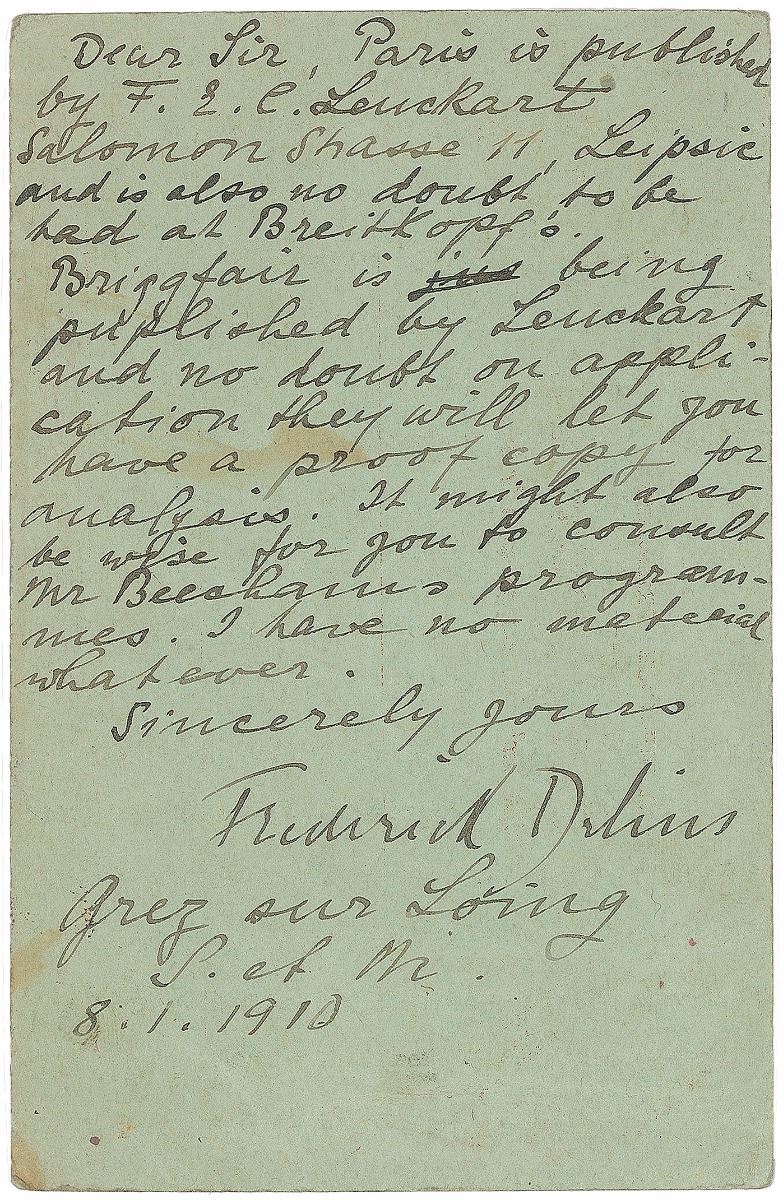 Renowned English composer (1862–1934) who incorporated American and European influences to form a unique style. Scarce ALS, one page on a 3.5 x 5.5 postcard, January 8, 1910. Letter to music critic Edwin Evans. In part: “Briggfair is being published by Leuckart and no doubt on application they will let you have a proof copy for analysis. It might also be wise for you to consult Mr. Beecham’s programmes.” Addressed on the reverse in Delius’s hand. In very good to fine condition, with light handling wear. The conductor Thomas Beecham played a major part in bringing Delius to prominence by performing his work.