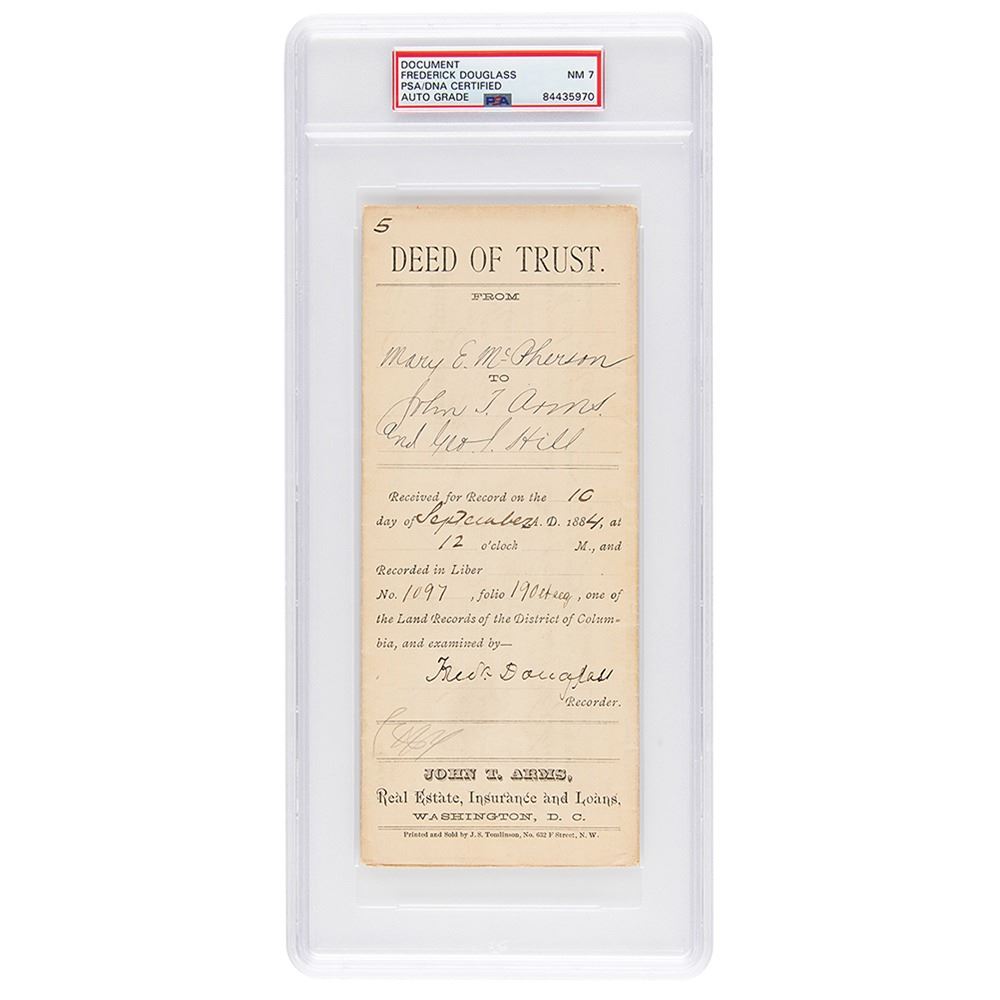 Partly-printed DS, signed “Fred'k Douglass,†3.5 x 8.5, April 14, 1886. Deed transaction between Mary E. McPherson and John T. Arms and George S. Hill, signed on the docketing panel in ink by Frederick Douglass as recorder of deeds in the District of Columbia. In fine condition. Encapsulated in a PSA/DNA authentication holder, grading the autograph as "NM 7."