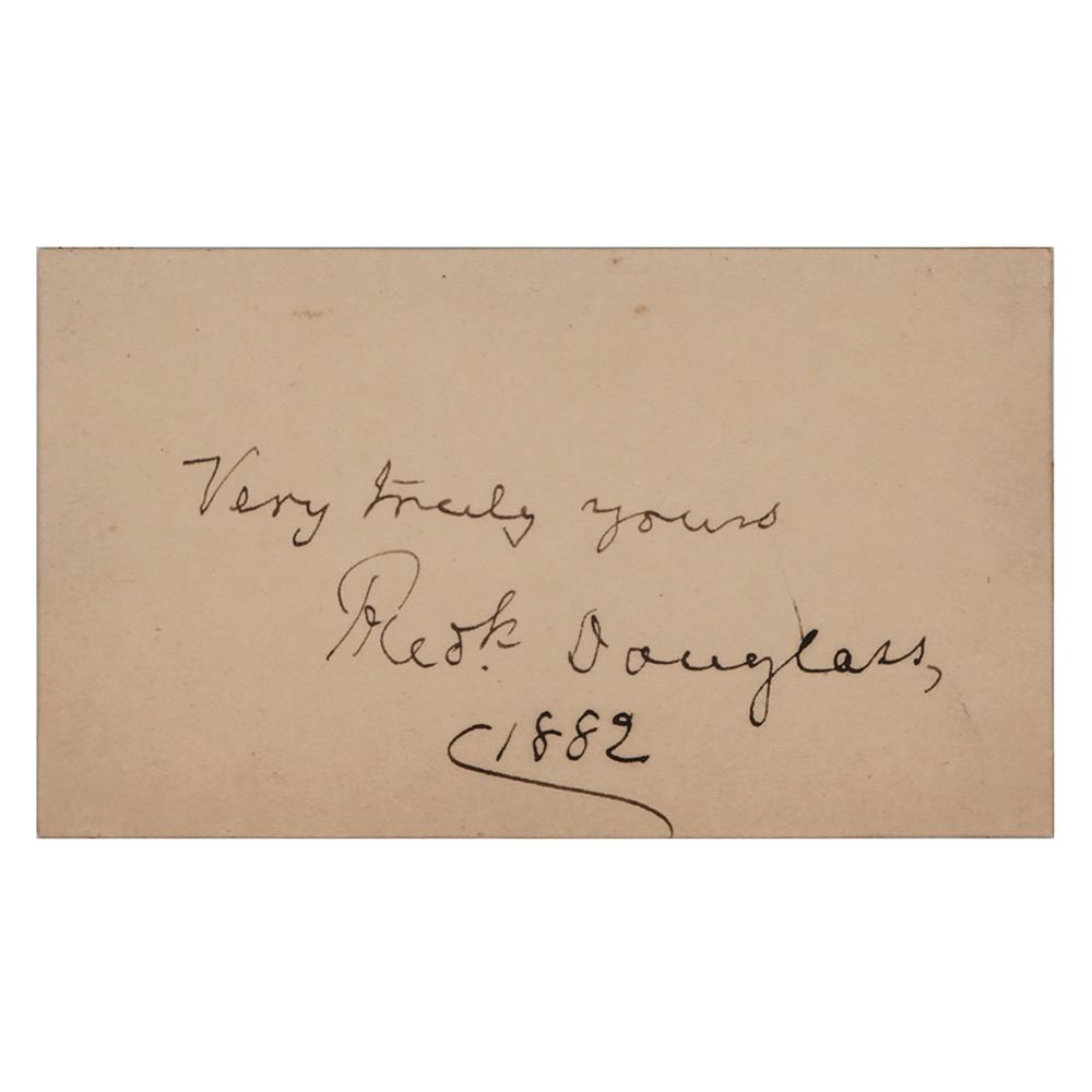 Neat and highly desirable ink signature, "Very truly yours, Fred'k Douglass, 1882,†on an off-white 3.25 x 2 card. In fine condition, with old mounting remnants on the back.
