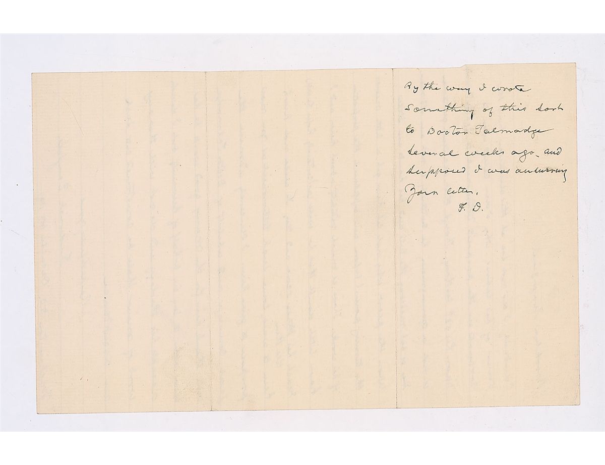 Former slave (1818–1895) who lent his eloquent, powerful voice to the abolitionist movement. ALS, one page, lightly-lined, 5.75 x 9.25, December 15, 1884. Letter to the Brooklyn Magazine. In full: “Candidly I do not see at this distance from the scene of his labors, why I am called upon to cooperate in the proposed testimonial to Doctor Talmadge [sic, Talmage] upon his 53d birthday. Though that excellent gentleman is not a young man, he certainly is not an old man. He is but midway the field and his hands are still upon the plow. Why not let him get a little nearer the turning point before we applaud the perfection of his work. There is much vitality about him, and I have little doubt that he will (as I certainly hope he will) reach his three score and ten. It will not hurt him to wait till then some such testimonial as you now propose to give him. I sincerely admire the zeal, courage and ability of Doctor Talmadge and thank him for the many good words he has been able to say in behalf of humanity but I do not accept his theology and do not wish that any word of mine shall be construed into such an acceptance.” A couple creases to lower right corner, lightly touching the end of the signature, and a trimmed right edge, otherwise fine condition.