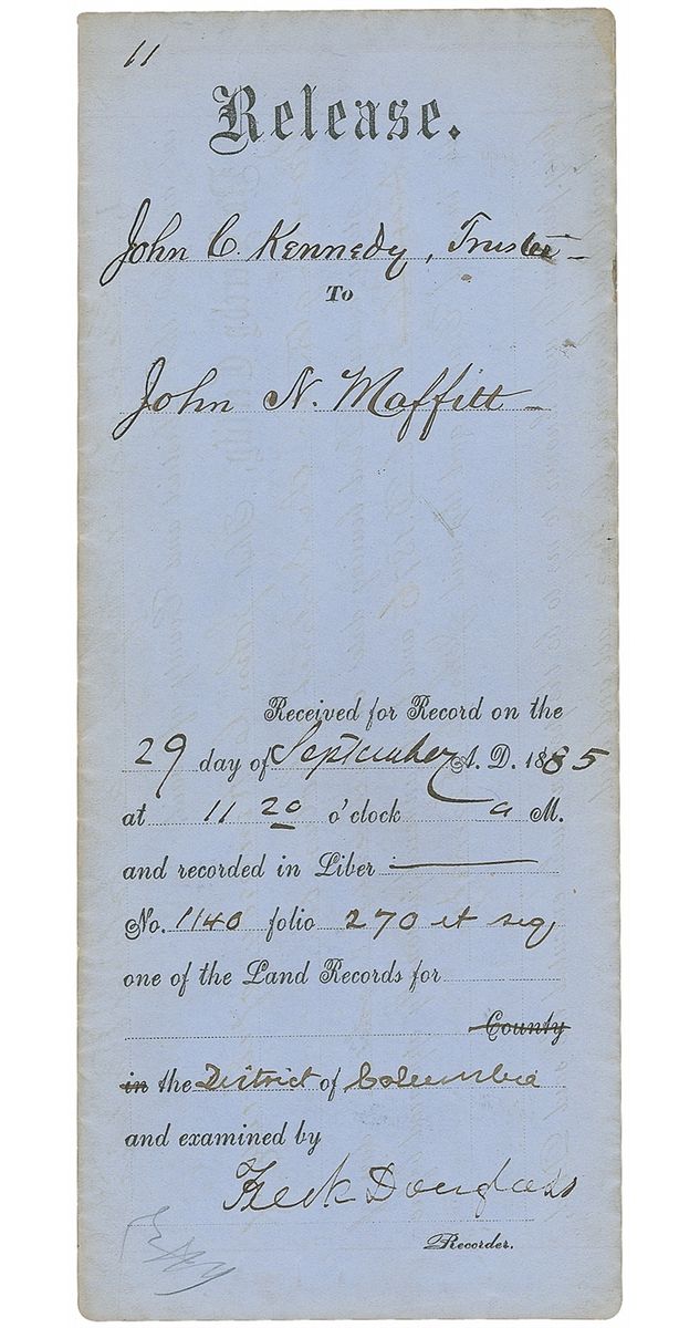 Partly-printed DS, signed “Fredk Douglass,” three pages on two adjoining sheets, 8.5 x 14, September 29, 1885. A release of property title between John C. Kennedy from John N. Maffitt signed on an outside panel by Douglass in his capacity as Recorder of Deeds. Scattered toning and soiling, expected document wear and creases, and slight edge loss, otherwise fine condition. Maffitt was a famous Confederate naval officer and blockade runner.