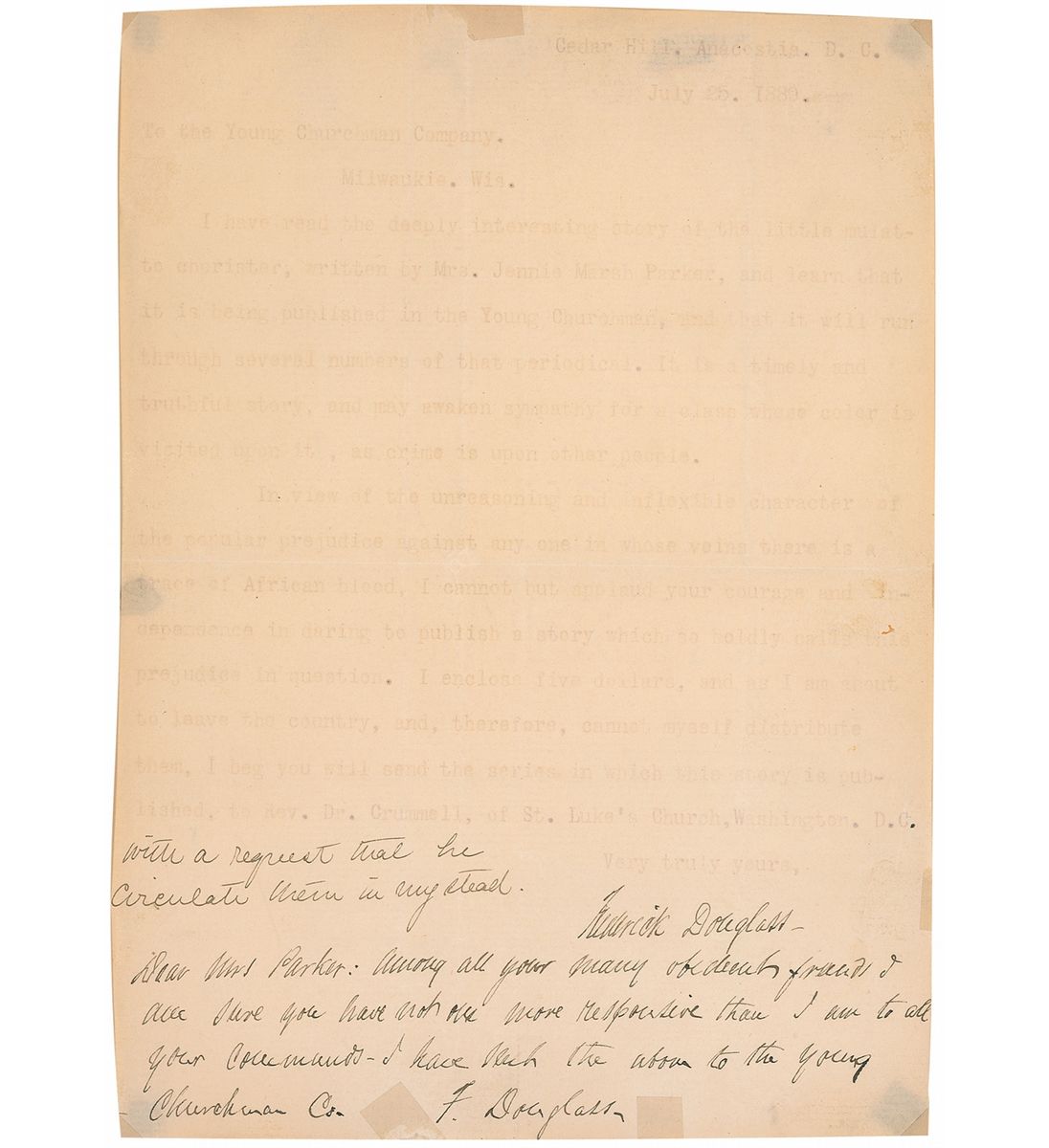 Incredible-content TLS, one page, 7 x 10, July 25, 1889. Douglass praises the Young Churchman Company for an unknown story, in part: “[The story] is a timely and truthful story, and may awaken sympathy for a class whose color is visited upon it, as a crime is upon other people. In view of the unreasoning and inflexible character of the popular prejudice against any one in whose veins there is a trace of African blood, I cannot but applaud your courage and independence in daring to publish a story which so boldly calls this prejudice in question.” At the bottom, Douglass writes a postscript to Jennie Marsh Parker: “Among all your many obedient friends, I am sure you have not one more responsive than I am to all your commands—I have sent the above to the Young Churchman Co. F. Douglass.” The letter is affixed by its edges to a slightly larger mat and mount. In very good condition, with intersecting folds, one fold affecting a single letter of each signature, ink notation above postscript, mounting remnants to edges, and the typed text extremely light and quite difficult to read. Douglass and Parker had been friends for more than 40 years when the abolitionist and suffragist sent her this letter. At the time, Parker was a writer who contributed stories to the Young Churchman newspaper, and Douglass was obviously moved by her words, applauding her for publishing a story questioning “the popular prejudice against any one in whose veins there is a trace of African blood.”