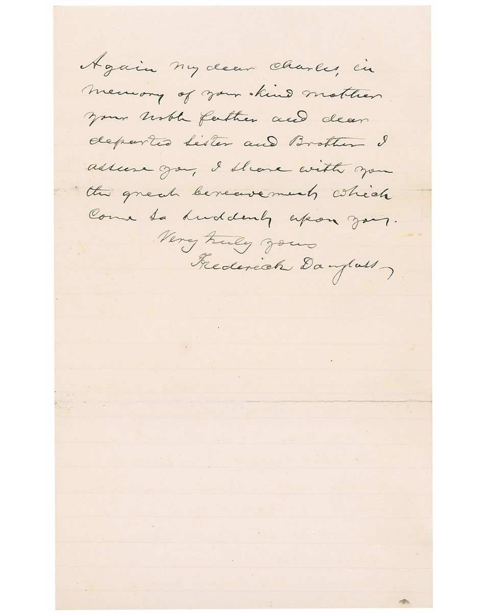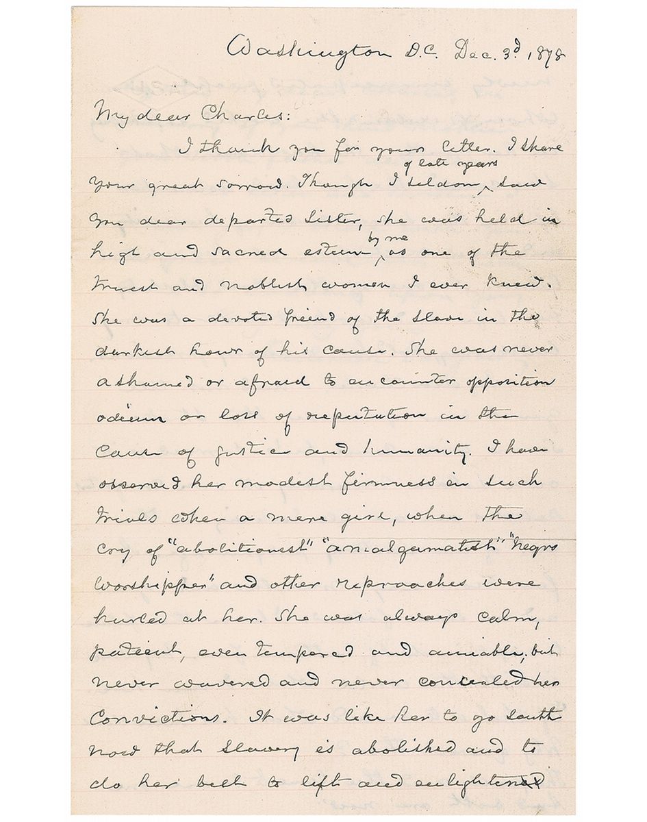 Incredible ALS, three pages, lightly-lined on two adjoining sheets, 5 x 8, December 3, 1878. Letter to “My dear Charles,” on the death of Charles’s sister, an abolitionist. In full: “Your dear departed sister, she was held in high and sacred esteem by me as one of the truest and noblest women I ever knew. She was a devoted friend of the slave in the darkest hour of their cause. She was never shamed or afraid to encounter opposition odium or loss of reputation in the Cause of justice and humanity. I have observed her modest firmness in such trials when a mere girl, when the cry of ‘abolitionist’, ‘amalgamation’, ‘negro worshipper’ and other reproaches were hurled at her. She was always calm, patient, even tempered and amiable; but never wavered and never concealed her convictions. It was like her to go south now that Slavery is abolished and to do her best to lift and enlightened newly emancipated people for whose freedom She worked so faithfully in her youth. She has done what she could. She has laid down her life in the sacred cause of humanity–and now rests from all her righteous labors. As one of the class blest by her life and works I shall to my latest day, hold her memory precious.