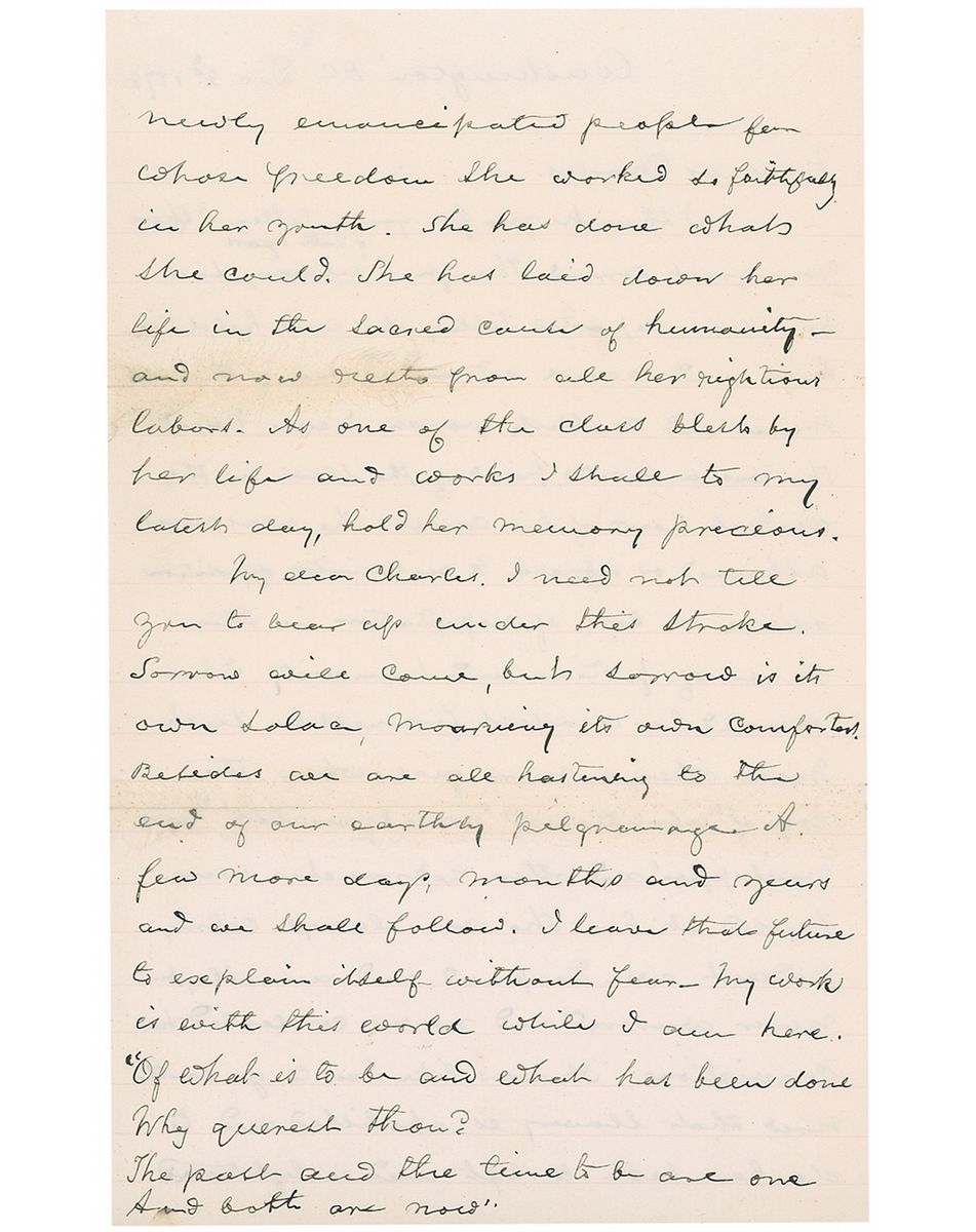 My dear Charles. I need not tell you to bear up under this stroke. Sorrow will come, but sorrow is its own solace, mourning its own comforter. Besides we are all hastening to the end of our earthly pilgrimage. A few more days, months and years and we shall follow. I leave that future to explain itself without fear—My work is with this world while I am here. ‘Of what is to be and what has been done Why querest thou? The path and the time to be are one and both are now.’ Again my dear Charles, in memory of your kind mother your noble father and dear departed sister and brother I assure you, I share with you the great bereavement which came so suddenly upon you.” Reinforced horizontal folds and some mild toning, otherwise fine condition.