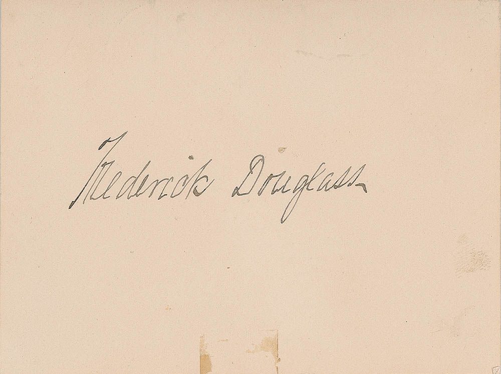 Precise ink signature, “Frederick Douglass,” on an off-white 4 x 3 card. In fine condition, with small tape remnant to lower edge, and some light toning and soiling.