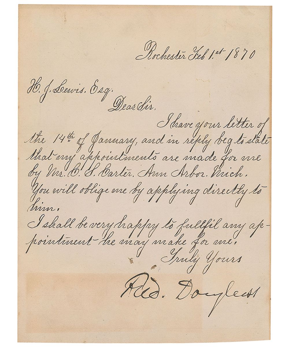 LS signed “Fred. Douglass,” one page, 5 x 6.5, Rochester, February 1, 1870. Letter to H. J. Lewis. In part: “Any appointments are made for me by Mr. C. S. Carter, Ann Arbor, Mich. You will oblige me by applying directly to him. I shall be happy to fullfil