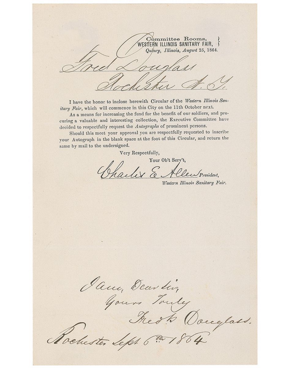 Former slave (1818–1895) who lent his eloquent, powerful voice to the abolitionist movement. Civil War–dated DS, signed “I am, Dear Sir, Yours Truly, Fred’k Douglass, Rochester, Sept. 6th 1864,” one page, 5 x 8, August 25, 1864. Douglass signs at the conclusion of an autograph request document issued by the Western Illinois Sanitary Fair Committee. In part: “As a means for increasing the fund for the benefit of our soldiers, and procuring a valuable and interesting collection, the Executive Committee have decided to respectfully request the Autographs of prominent persons.” In fine condition. Douglass had been publishing abolitionist newspapers in Rochester for many years, and in 1863 began to help recruit African-Americans to serve in the Union Army.
