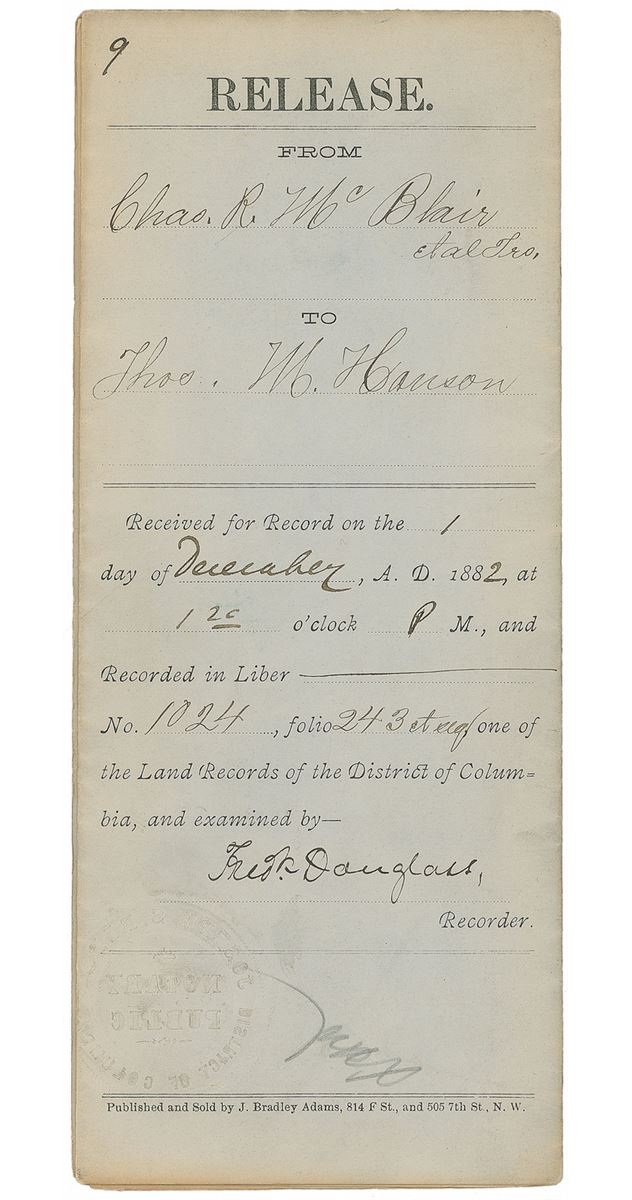 DS, signed “Fred’k Douglass,” three pages on two adjoining sheets, 8.5 x 14, December 1, 1882. A release for a real estate transaction between Charles R. McBlair and Thomas M. Hanson. Signed on the reverse docketing panel by Douglass as a recorder of deeds. In fine condition, with expected document wear and toning to edges.