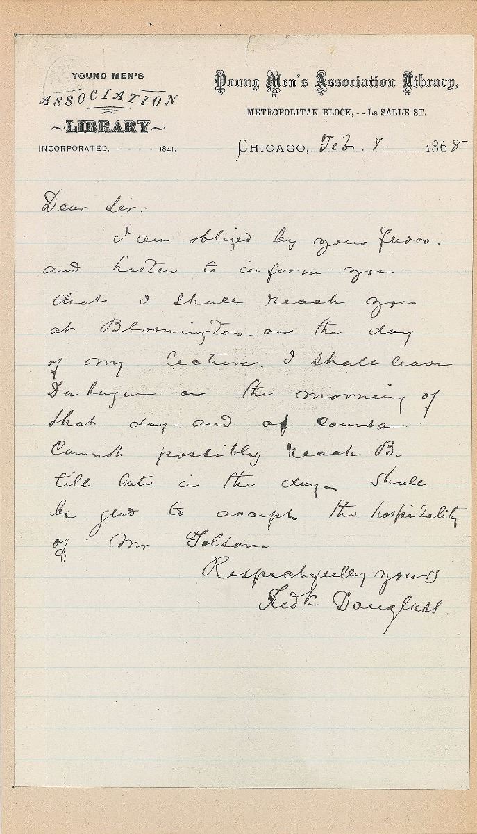 ALS signed “Fred’k Douglass,” one page, lightly-lined, 5 x 8.25, Young Men’s Association Library letterhead, February 7, 1868. In part: “I am obliged by your favor and hasten to inform you that I shall reach you at Bloomington on the day of my lecture. I shall leave…the morning of that day, and of course cannot possibly reach B. till late in the day—shall be glad to to accept the hospitality of Mr. Folsom.” Affixed along the left edge to a slightly larger sheet. In fine condition.