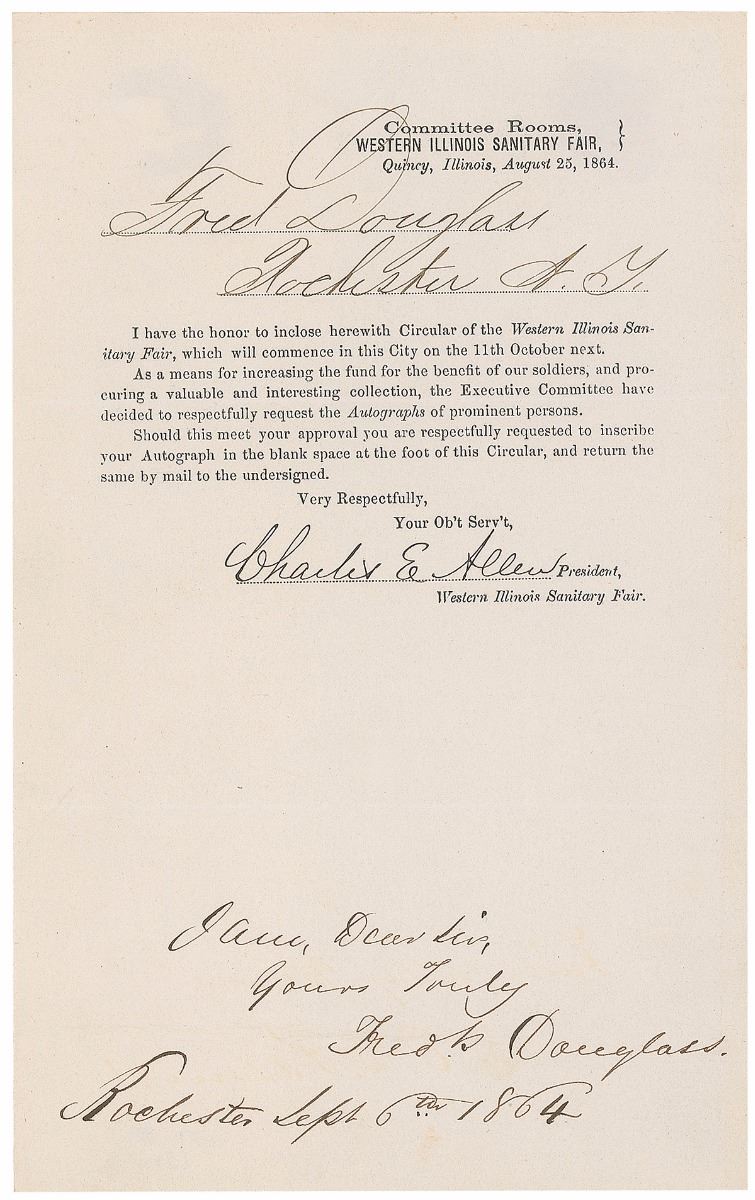 Civil War–dated DS, signed “I am, Dear Sir, Yours Truly, Fred’k Douglass, Rochester, Sept. 6th 1864,” one page, 5 x 8, August 25, 1864. Douglass signs at the conclusion of an autograph request document issued by the Western Illinois Sanitary Fair Committee, in part: “As a means for increasing the fund for the benefit of our soldiers, and procuring a valuable and interesting collection, the Executive Committee have decided to respectfully request the Autographs of prominent persons.” In fine condition, with wrinkling to top from two mounting remnants to reverse.