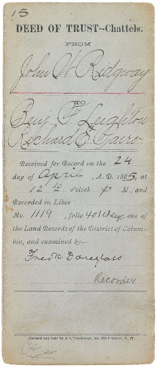 Partly-printed DS, signed “Fred’k Douglass,” three pages on two adjoining sheets, 8.5 x 14, April 24, 1885. Deed of trust for a transaction between John W. Ridgway and Benjamin F. Leighton and Richard E. Pairo, signed on the docketing panel by Douglass as recorder of deeds. In very good to fine condition, with light soiling, toning, and clean separations to folds.