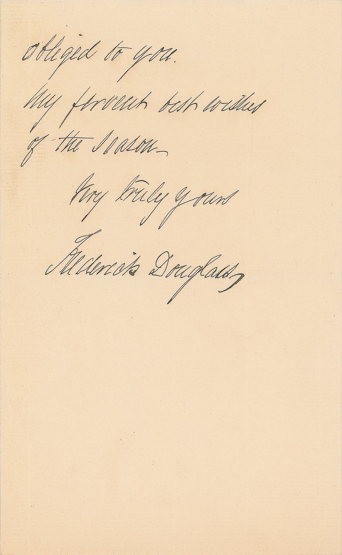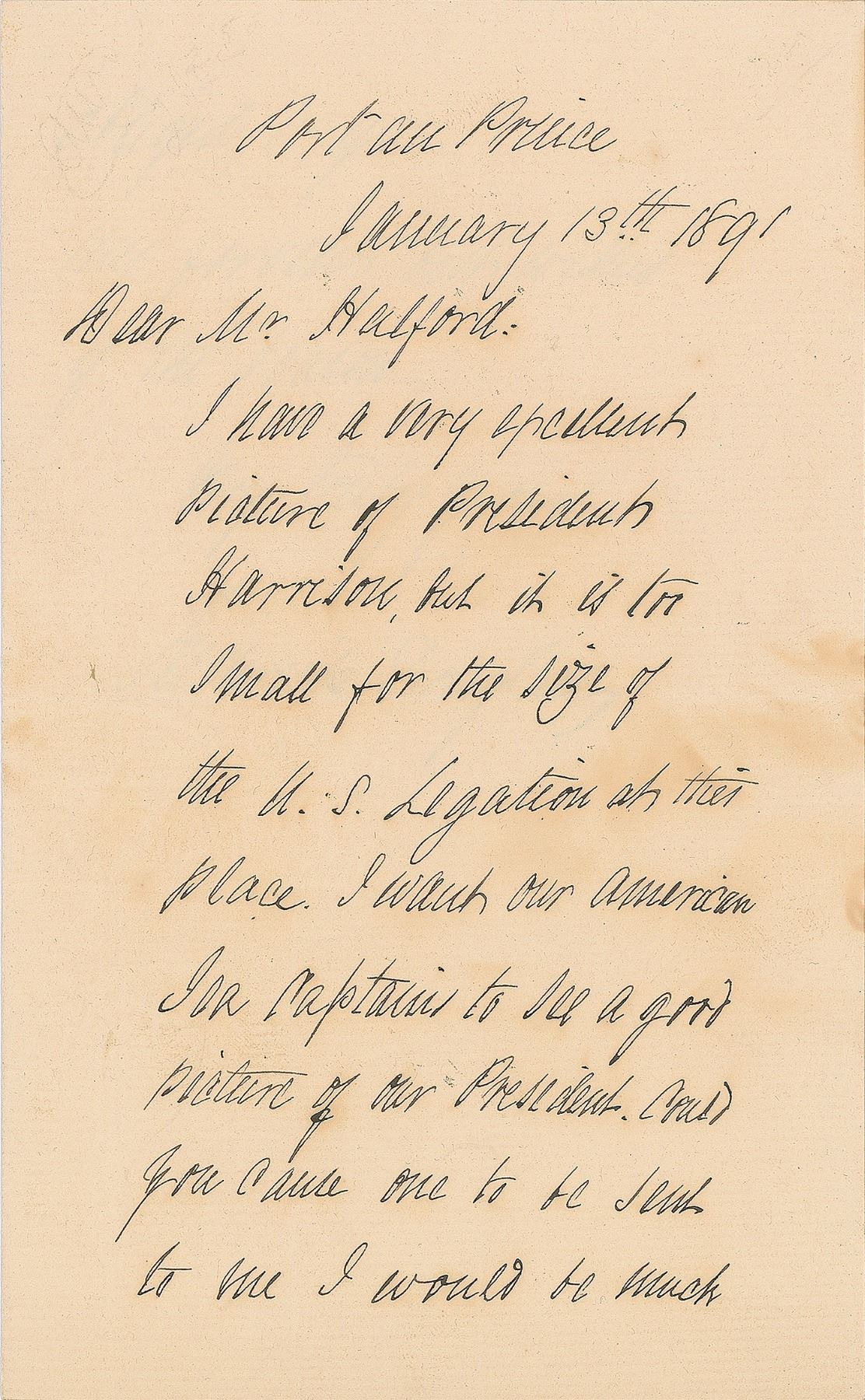 ALS, two pages on two adjoining sheets, 5 x 8, January 13, 1891. Letter to "Mr. Halford," written from Port-au-Prince, in full: "I have a very excellent picture of President Harrison, but it is too small for the size of the U.S. Legation at this place. I want our American sea captains to see a good picture of our President. Could you cause one to be sent to me I would be much obliged to you." In fine condition, with some light toning. In 1889, President Benjamin Harrison appointed Douglass to be the United States's minister resident and consul-general to the Republic of Haiti, a position in which he remained until July 1891. Intriguing content in a desirable autograph letter from the famed abolitionist.