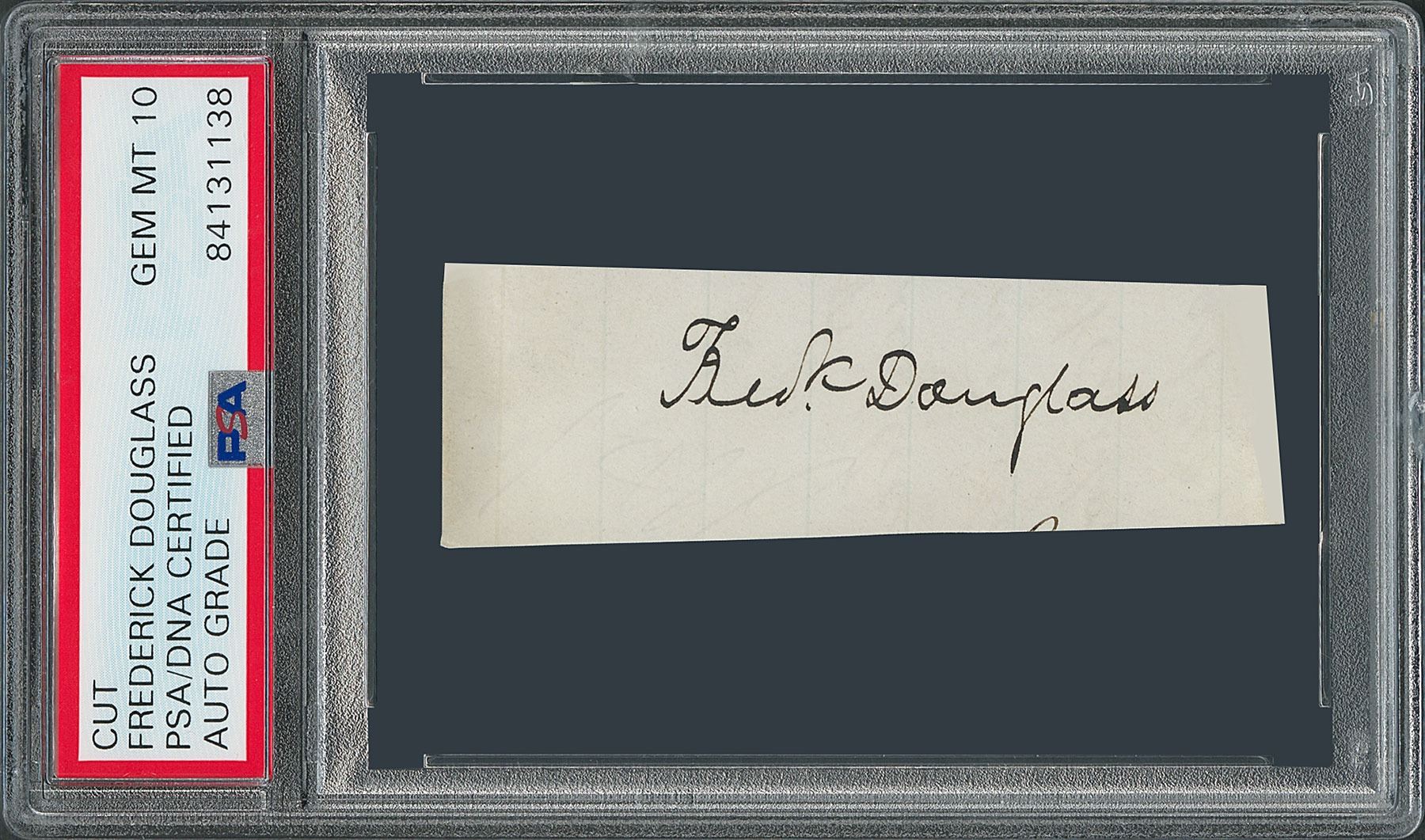 Crisp ink signature, "Fred'k Douglass,” on an off-white 3 x 1 slip. In fine condition. Encapsulated in a PSA/DNA authentication and grading holder, evaluating the autograph as "GEM MT 10."
