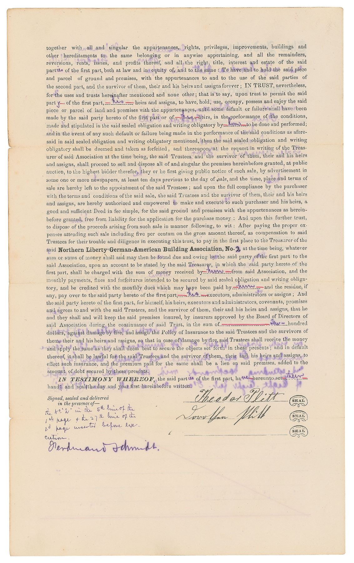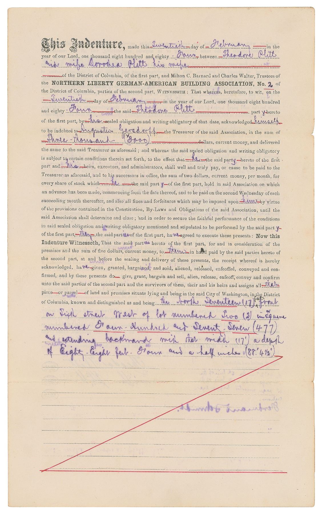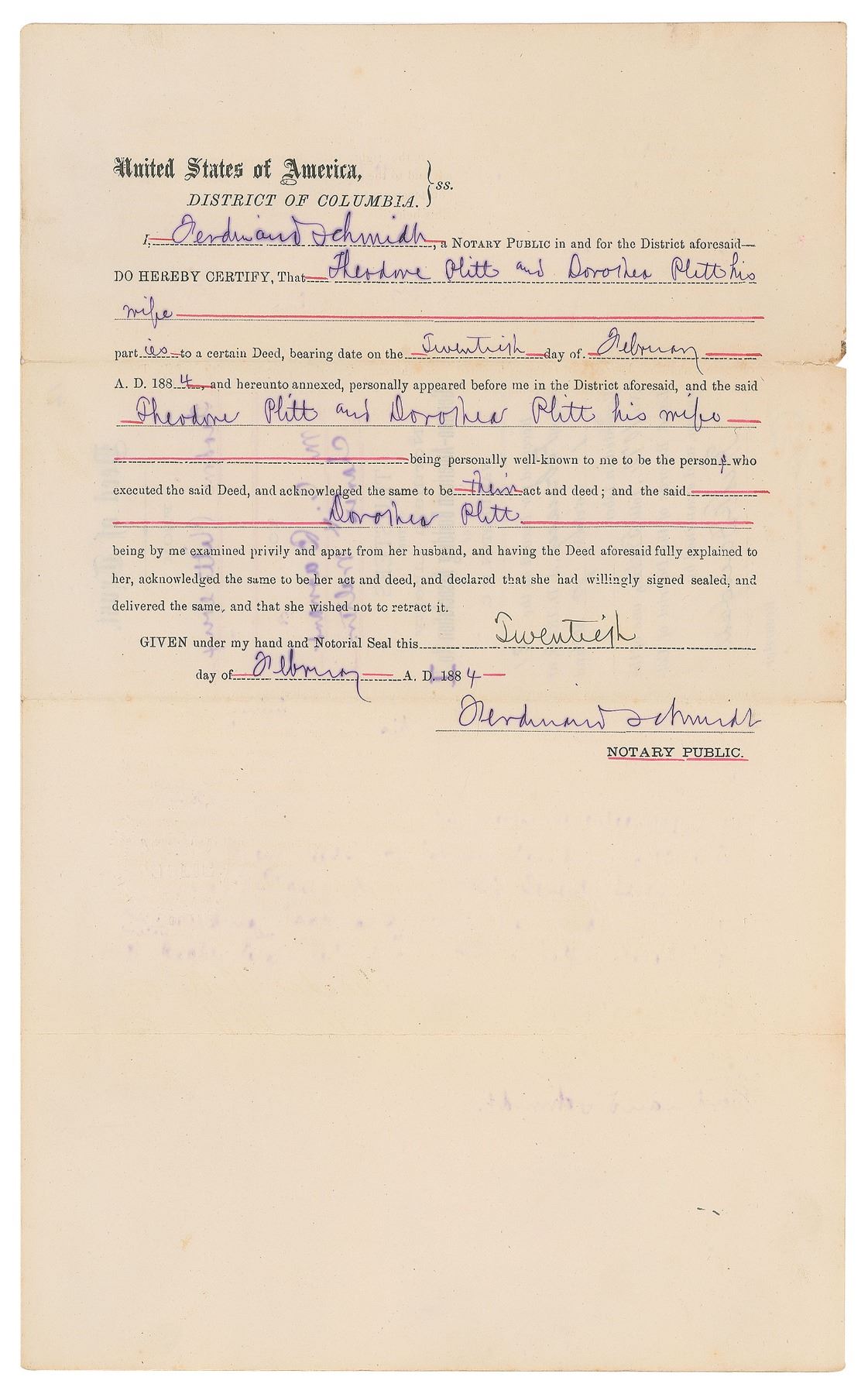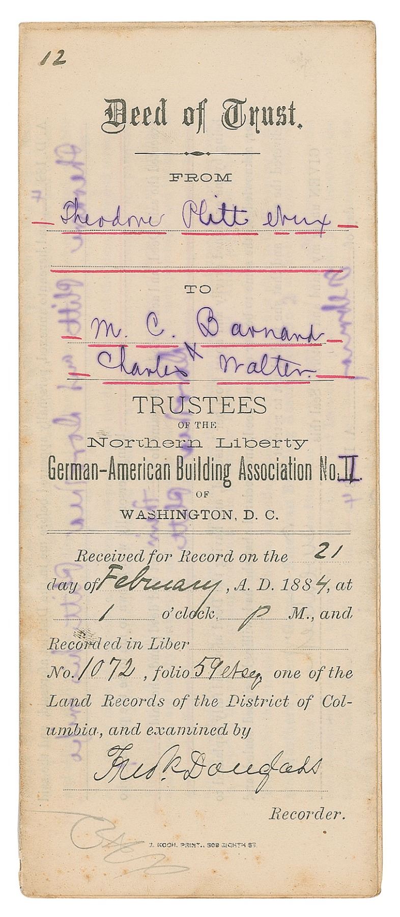 Partly-printed DS, signed “Fred'k Douglass,” 3.5 x 8.5, February 21, 1884. District of Columbia deed of trust from Theodore Plitt to M. C. Barnes and Charles Walter, signed in ink by Douglass as recorder of deeds. In fine condition.