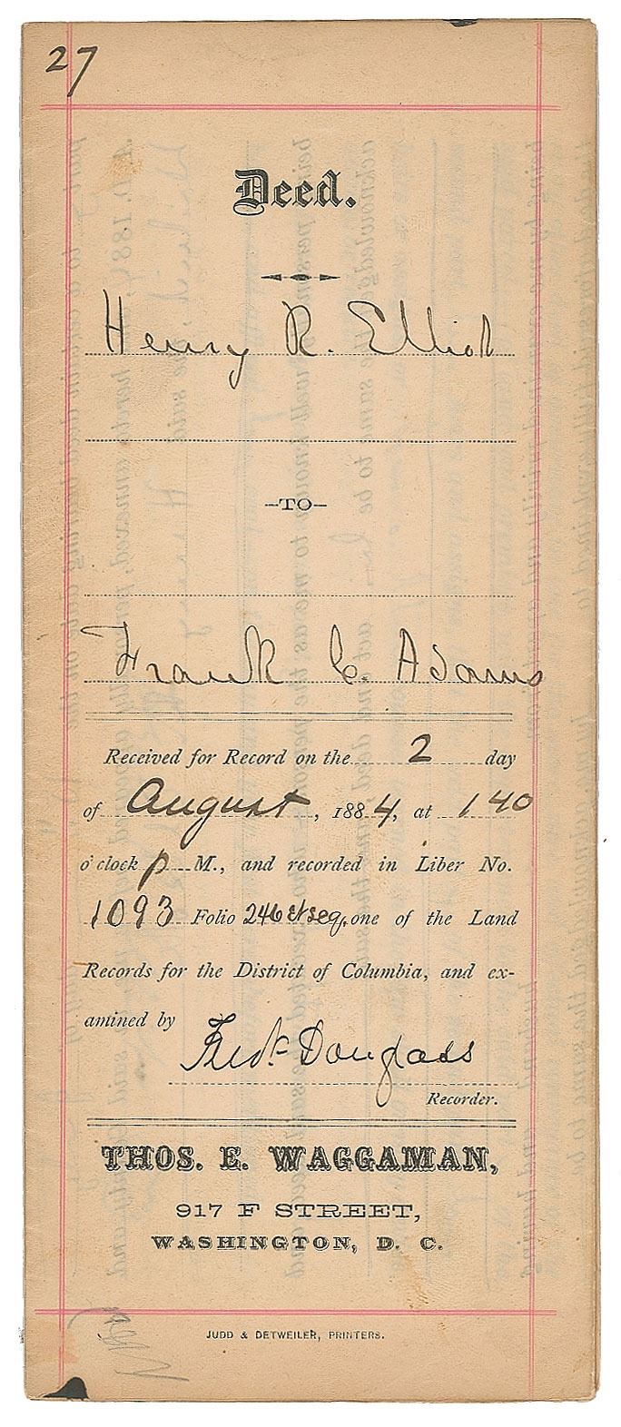 Partly-printed DS, signed “Fred'k Douglass,” three pages on two adjoining sheets, 8.5 x 14, August 2, 1884. Indenture between Henry R. Elliot and Frank C. Adams for the sale of a plot of land in Washington, D.C. Signed on the docketing panel in ink by Douglass as recorder of deeds in the District of Columbia. In fine condition.