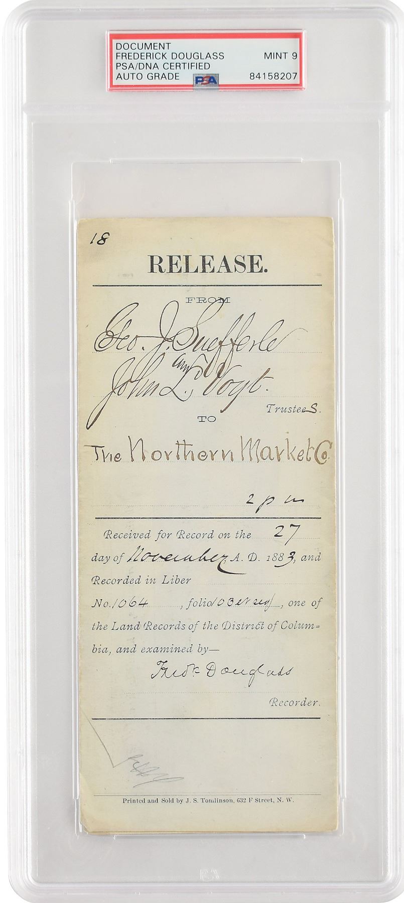 Partly-printed DS, signed “Fred'k Douglass,” one page, 3.5 x 8.5, November 27, 1883. Folded release document for a land transaction in Washington, D.C., signed on the docketing panel by Douglass as recorder of deeds in the District of Columbia. In fine condition. Encapsulated and graded by PSA/DNA as "MINT 9."