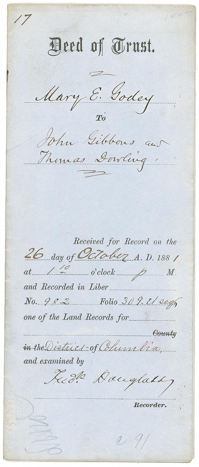 Partly-printed DS, signed “Fredk. Douglass,” two pages, 3.5 x 8.5 (size of folded panel), and opening to a size of 8.5 x 13.75, October 26, 1881. A Deed of Trust between Mary E. Godey, John Gibbons, and Thomas Dowling, signed on an outer panel by Douglass as Recorder of Deeds. In fine condition, with scattered soiling and a few pencil notations.