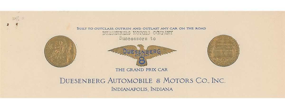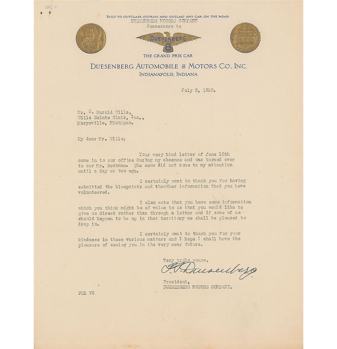 German-born automotive manufacturer (1876–1932). TLS signed “F. S. Duesenberg,” one page, 8.5 x 11, embossed Duesenberg ‘Straight 8’ letterhead, July 3, 1925. Letter to C. Harold Wills of automobile manufacturer Wills Sainte Clair, Inc. In part: “I certainly want to thank you for having submitted the blueprints and the other information that you have volunteered. I also note that you have some information which you think might be of value to us that you would like to give us direct rather than through a letter and if some of us should happen to be up in that territory we shall be pleased to drop in.” In fine condition, with intersecting folds (one vertical fold passing through a single letter of the signature), a rusty staple mark to the upper left corner, and some trivial foxing and toning to edges. Written upon extremely attractive and rare letterhead, this is an excellent association piece between two classic car manufacturers.