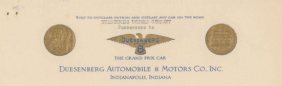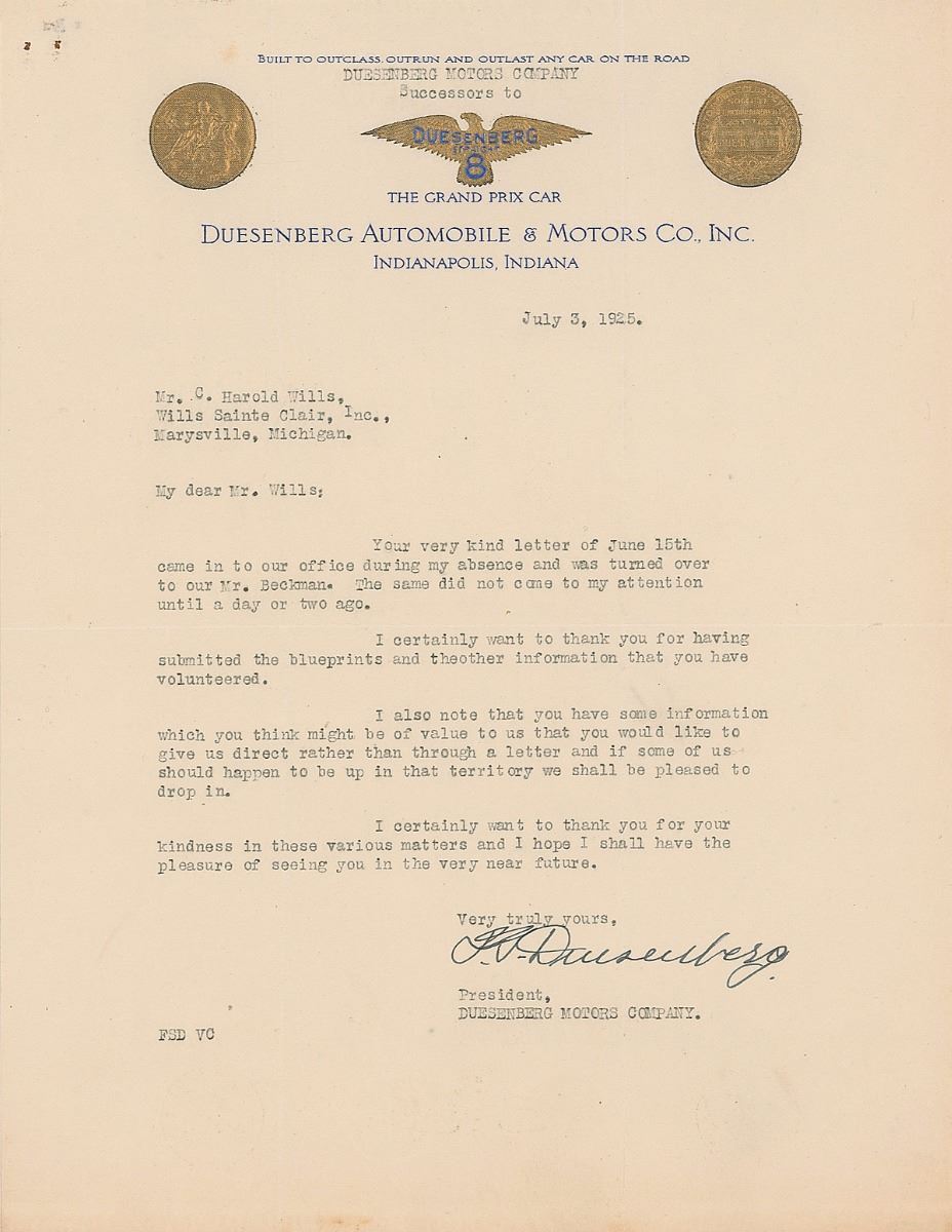 German-born automotive manufacturer (1876–1932). TLS signed “F. S. Duesenberg,” one page, 8.5 x 11, embossed Duesenberg ‘Straight 8’ letterhead, July 3, 1925. Letter to C. Harold Wills of automobile manufacturer Wills Sainte Claire, Inc. In part: “I certainly want to thank you for having submitted the blueprints and the other information that you have volunteered. I also note that you have some information which you think might be of value to us that you would like to give us direct rather than through a letter and if some of us should happen to be up in that territory we shall be pleased to drop in.” In fine condition, with rusty staple holes to upper left corner. Written upon extremely attractive and rare letterhead, this is an excellent association piece between two classic car manufacturers.