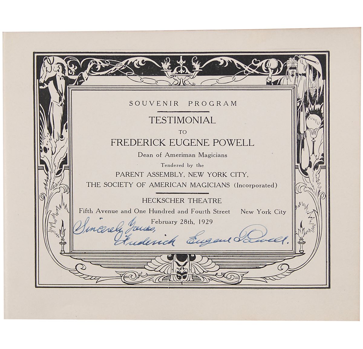 Dean of the Society of American Magicians (1856–1938) who, along with Imro Fox and Servais LeRoy, was part of the famed billing ‘Triple Alliance.’ Program for a testimonial presentation to Frederick Eugene Powell, held on February 28, 1929, at the Heckscher Theatre, signed on the ceremony title page in fountain pen, “Sincerely Yours, Frederick Eugene Powell.” In fine condition, with light wear to bottom edge of front cover. The James Collings Collection.