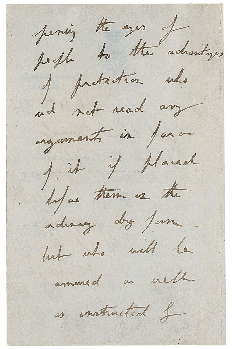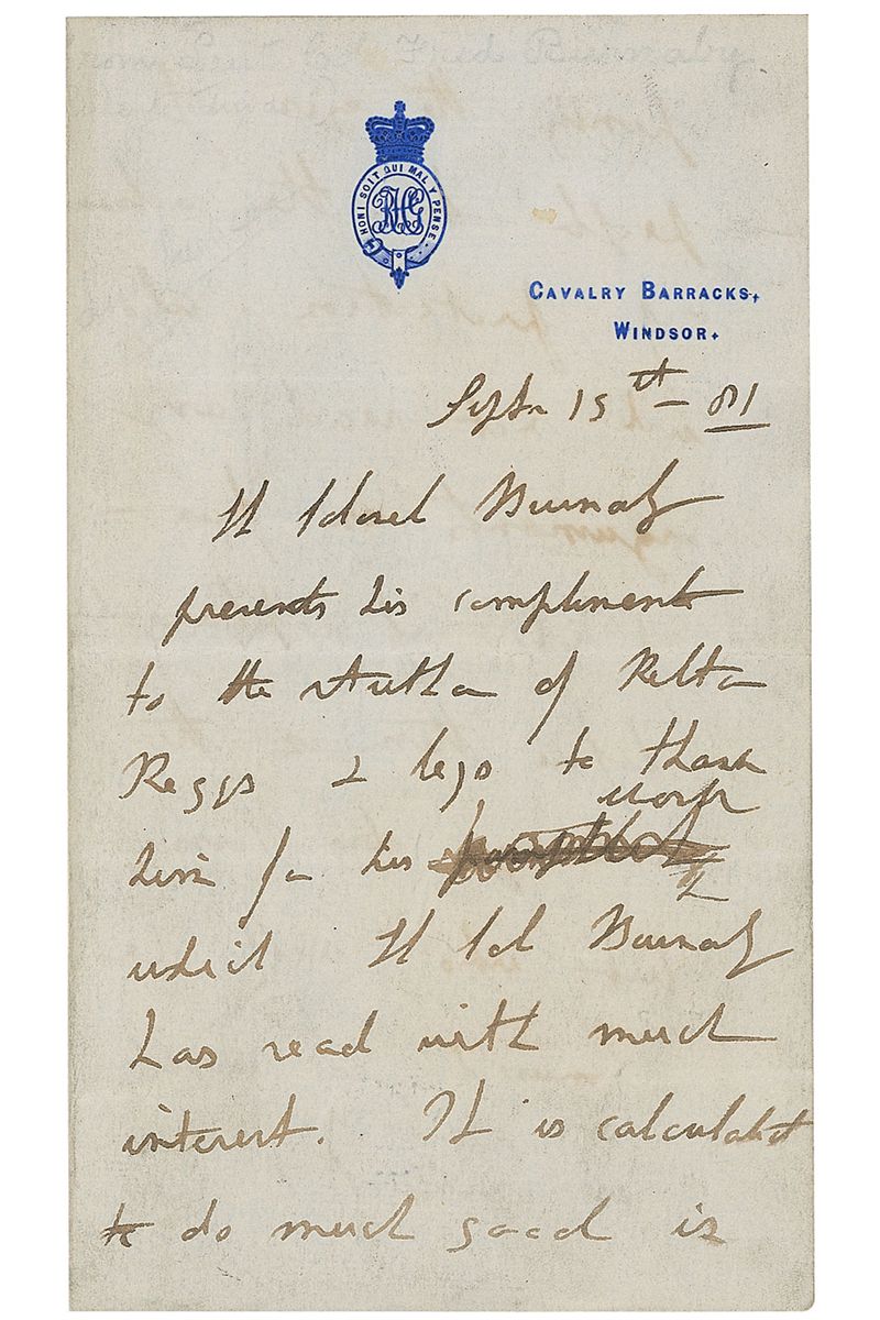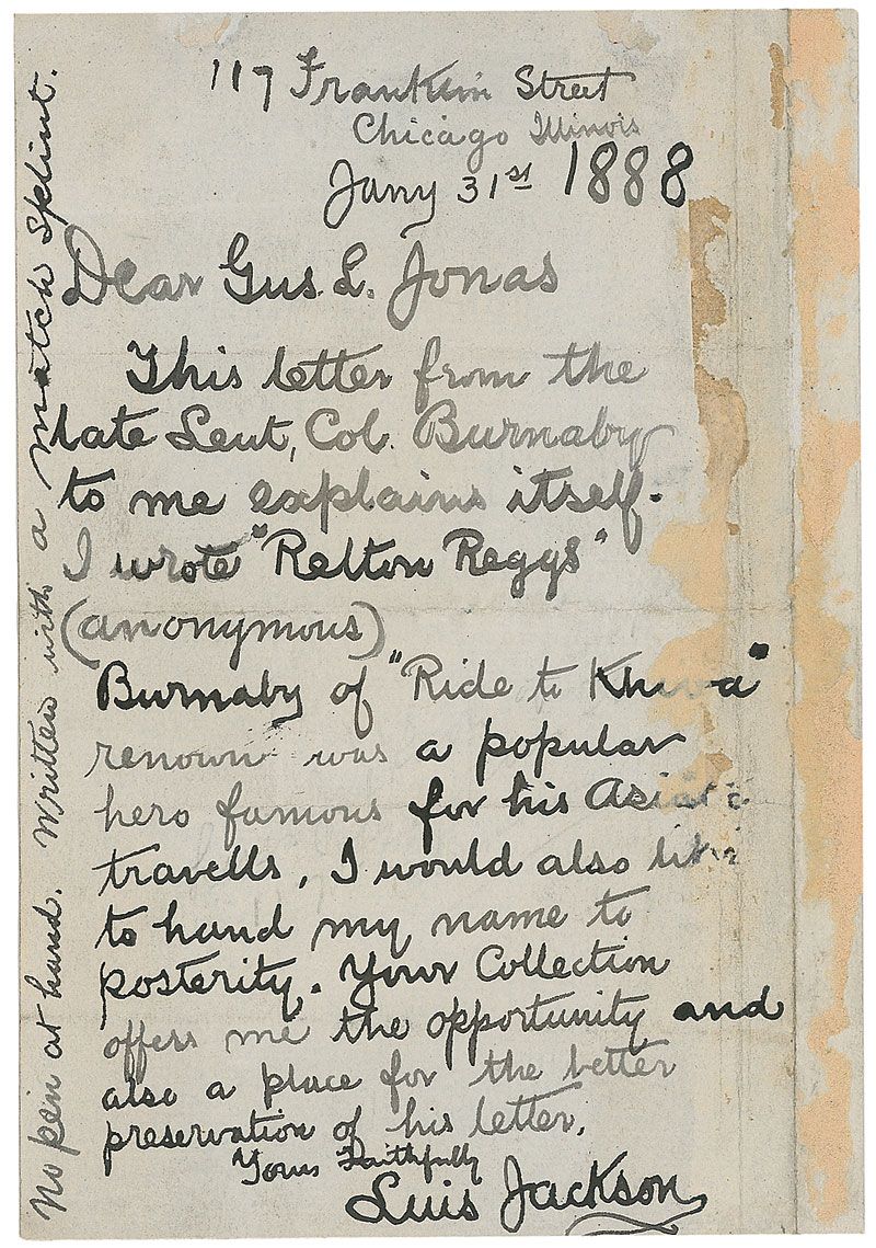 English traveler and soldier (1842–1885) known for describing his journey on horseback to the Khanate of Khiva through Russian Asia in the book A Ride to Khiva, which brought him immediate fame. Third-person ALS signed twice in the text, “Lt. Colonel Burnaby,” one page both sides, 4.75 x 7, Cavalry Barracks letterhead, September 15, 1881. In part: “Lt. Colonel Burnaby presents his compliments to the author of Relton Reggs & begs to thank him.” Reverse of second integral page bears an ALS from the aforementioned author and recipient of this letter, Luis Jackson, transmitting it to a collector. In fine condition, with some show-through from writing to opposing sides and mounting remnants to reverse.
