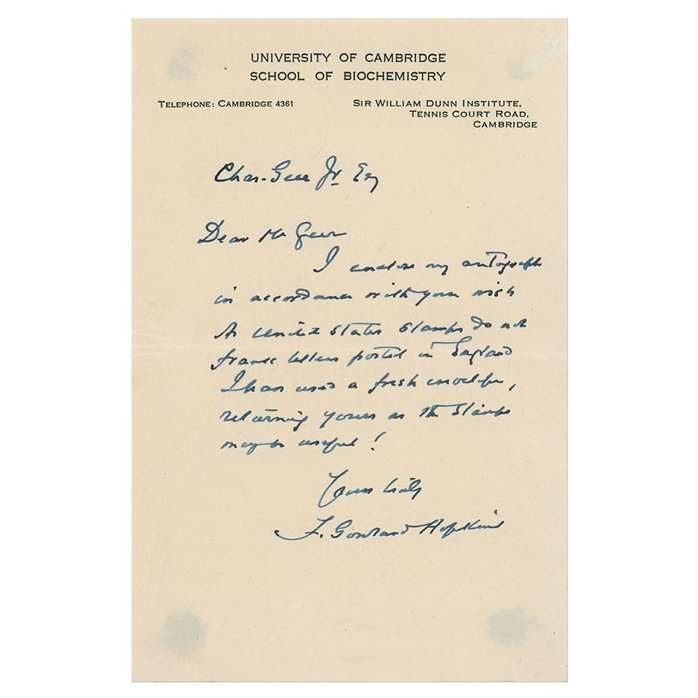 English biochemist (1861–1947) who was awarded the Nobel Prize in Physiology or Medicine in 1929, with Christiaan Eijkman, for the discovery of vitamins, despite the discovery generally being attributed to Casimir Funk. ALS signed “F. Gowland Hopkins,†one page, 4.5 x 7, University of Cambridge School of Biochemistry letterhead, no date. Handwritten letter to a collector, in part: "I enclose my autograph in accordance with your wish. As United States stamps do not frank letters posted in England, I have used a fresh envelope.' In fine condition, with show-through at the corners from old mounting remnants on the back.