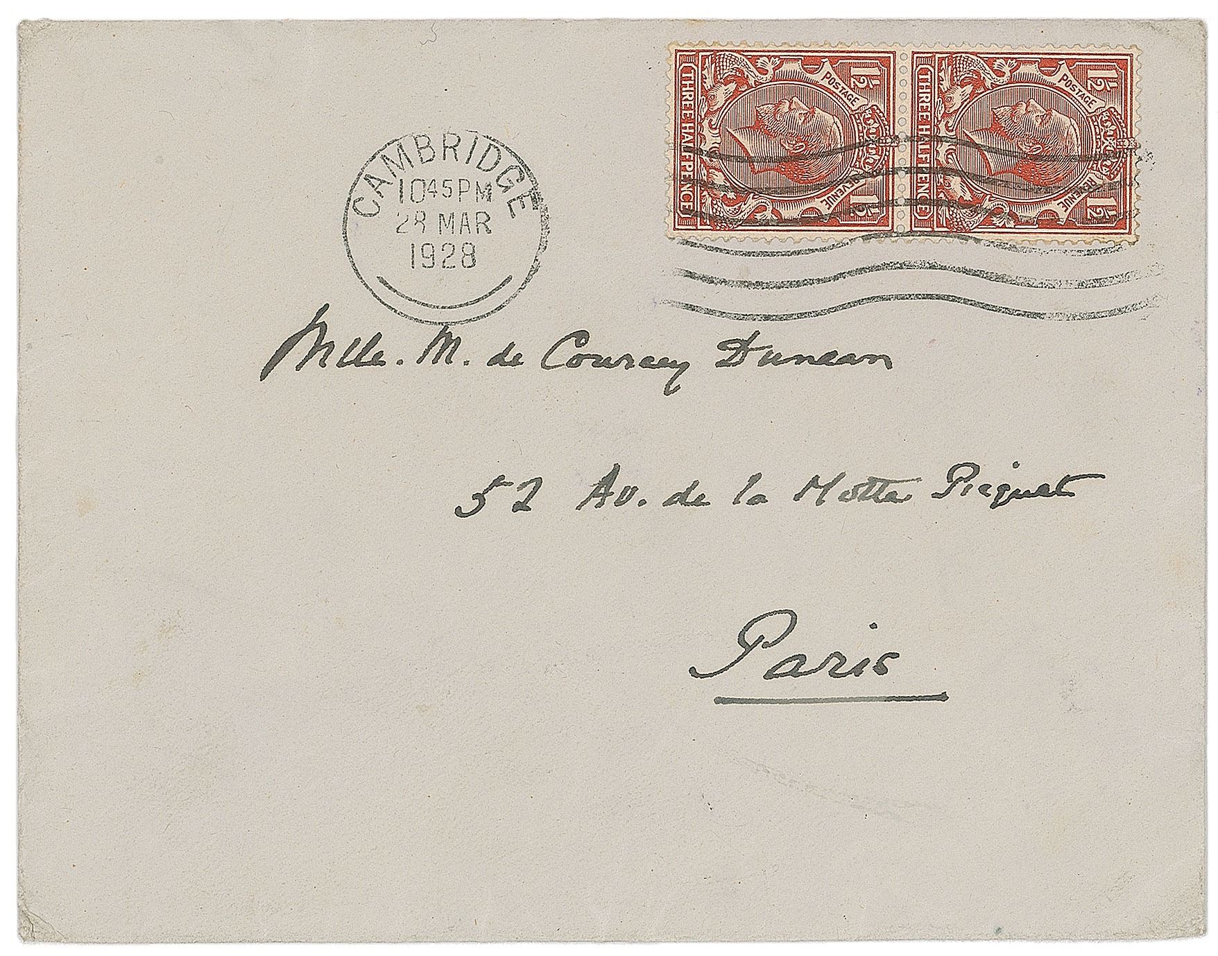 English biochemist (1861–1947) who was awarded the Nobel Prize in Physiology or Medicine in 1929, with Christiaan Eijkman, for the discovery of vitamins, despite the discovery generally being attributed to Casimir Funk. ALS signed “F. Gowland Hopkins,” one page, 6 x 8.75, personal letterhead, March 28, 1928. Letter to Mabel de Courcy Duncan, whose guest he had been. In part: "Your charming hospitality and the kindness of your sister and yourself I can never forget. The days were filled with delightful experiences, and, looking back on them, it seems that only by a sort of magic could so much pleasure have been provided for me in so a short time!" In fine condition. Accompanied by the original mailing envelope, addressed in Hopkins's hand.