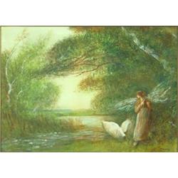 watercolour, signed, circa 1890, lakeside scene with maiden and swans, 27 x 38 cm