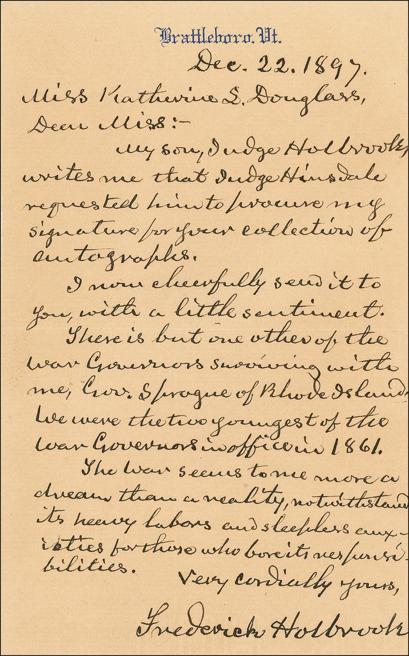 Agriculturalist (1814-1909) who served as governor of Vermont during the Civil War. ALS, one page, 4.5 x 7.25, December 22, 1897. The now-retired governor responds to an autograph request and reflects on the Civil War. In full: “My son, Judge Holbrook, write me that Judge Hinsdale requested him to forward my signature for your collection of autographs. I now cheerfully send it to you, with a little sentiment. There is but one other of the War Governors surviving with me, Gov. Sprague of Rhode Island. We were the two youngest of the War Governors in office in 1861. The war seems to me more a dream than a reality, notwithstand its heavy labors and sleepless anxieties for those who bore its responsibilities.” In fine condition, with uniform overall toning. RRAuction COA.