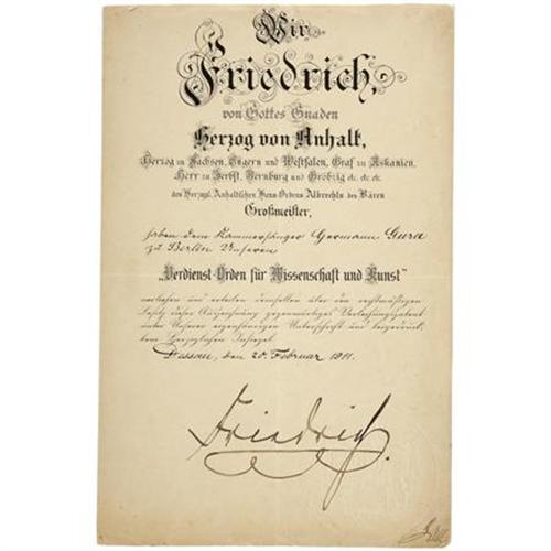 <B>Frederick II, Duke of Anhalt, Document Signed,</B></I> four integral pages written on page one, 9" x 13.75", Dessau, February 20, 1911, in German. It is a bestowal document for the Duchy of Anhalt's Order of Merit for Science and Art (<I>Verdienstorden fur Wissenschaft und Kunst</B></I>). Boldly signed with the embossed seal of Anhalt. General toning and folds, else very good. During his reign Frederick was known for his love of music and maintained a court theatre which became celebrated throughout Europe. Sold with a real photo postal card featuring the duke.<BR><BR><BR><b>Shipping:</b> Flat Material, Small (<a target="_blank" href="http://www.heritageauctions.com/common/shipping.php">view shipping information</a>)