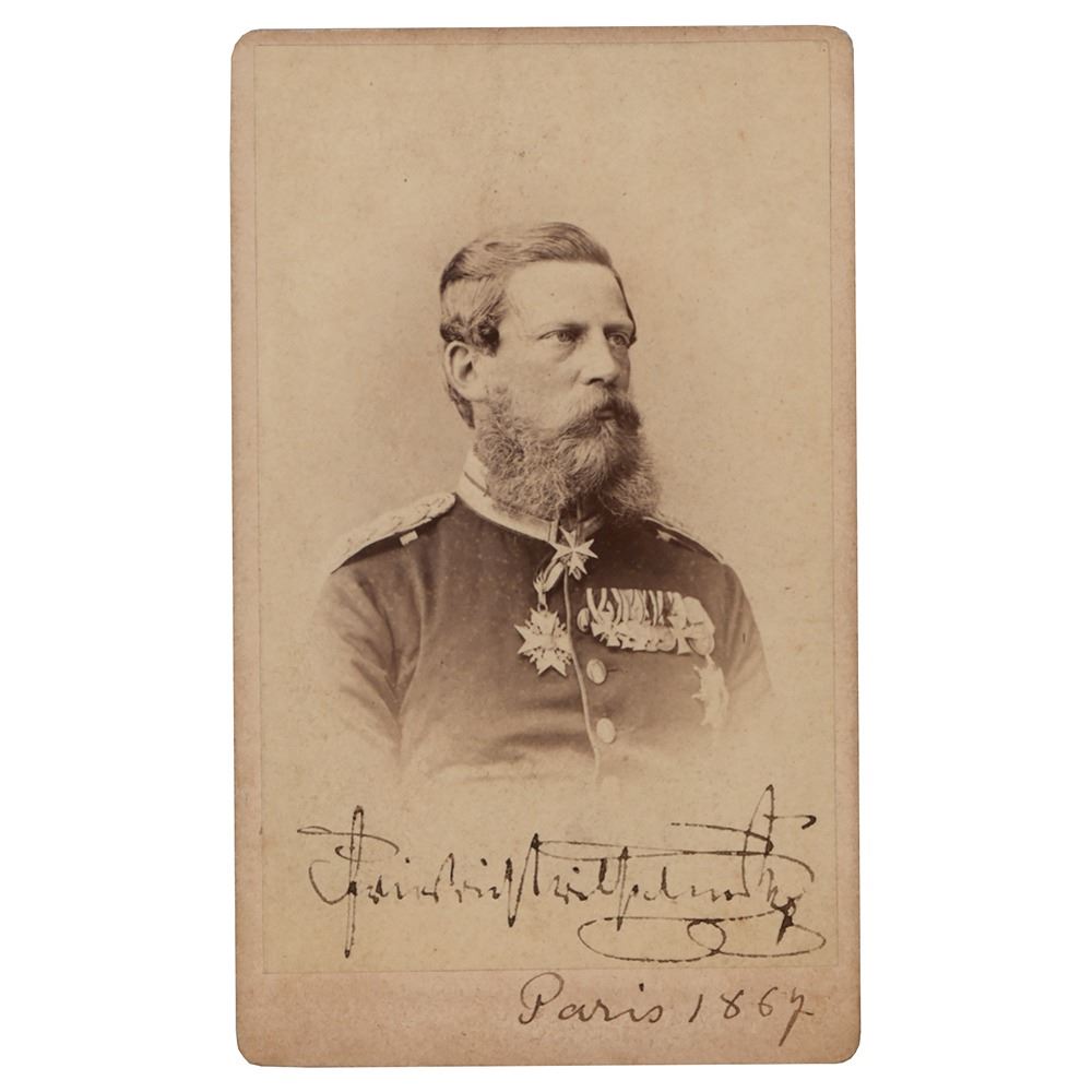 German Emperor and King of Prussia between March and June 1888, during the 'Year of the Three Emperors.' He assumed the throne upon the death of his father, Wilhelm I, and was succeeded by his son, Wilhelm II, following his brief reign and death from cancer of the larynx. Scarce 2.25 x 4 carte-de-visite photo of Frederick III of Germany by Hermann Selle of Potsdam, signed at the bottom of the image in ink, "Friedrich Wilhelm." Annotated on the mount in another hand, "Paris 1867." In fine condition, with slight ink skipping.
