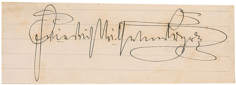 Ink signature, “Frederick William, Prince,” on an off-white 6 x 2 lightly-lined slip. Affixed to an off-white 9 x 10 sheet along with a small etching of him. Scattered toning and soiling, otherwise fine condition.