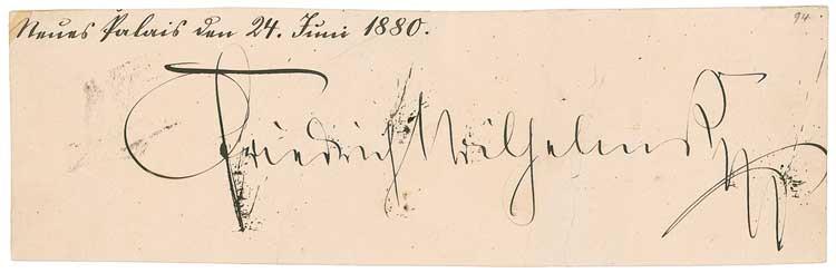 Emperor of Germany and King of Prussia (born 1831) for only 99 days before his death in 1888. Ink signature, “Frederick William R,” on an off-white 8.25 x 2.5 slip. Slip is dated in another hand 1880. In very good condition, with well done repairs to two diagonal separations, both lightly affecting signature, scattered light soiling and creasing, and some stray ink flecks. RRAuction COA.