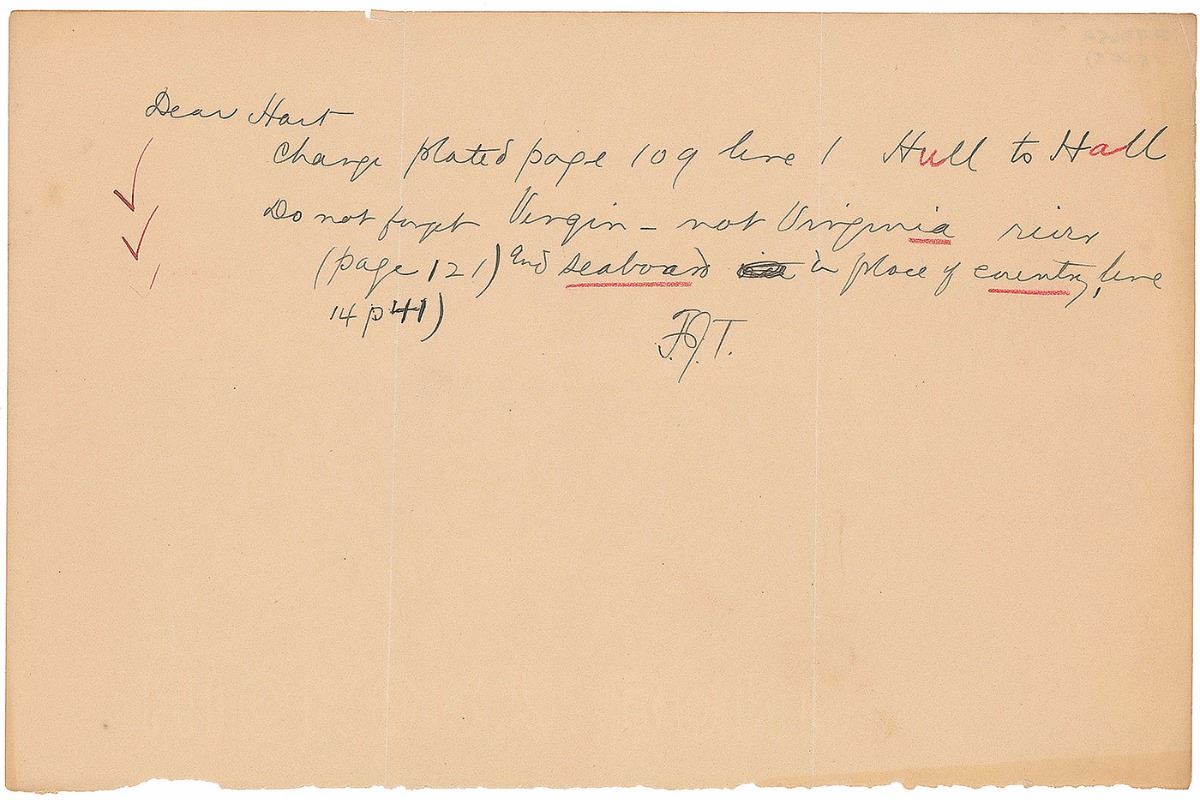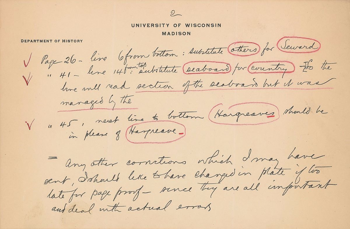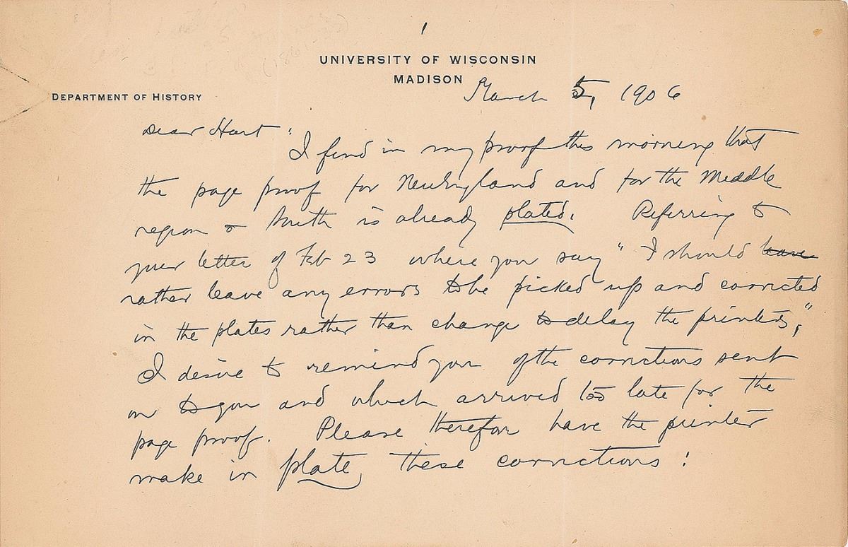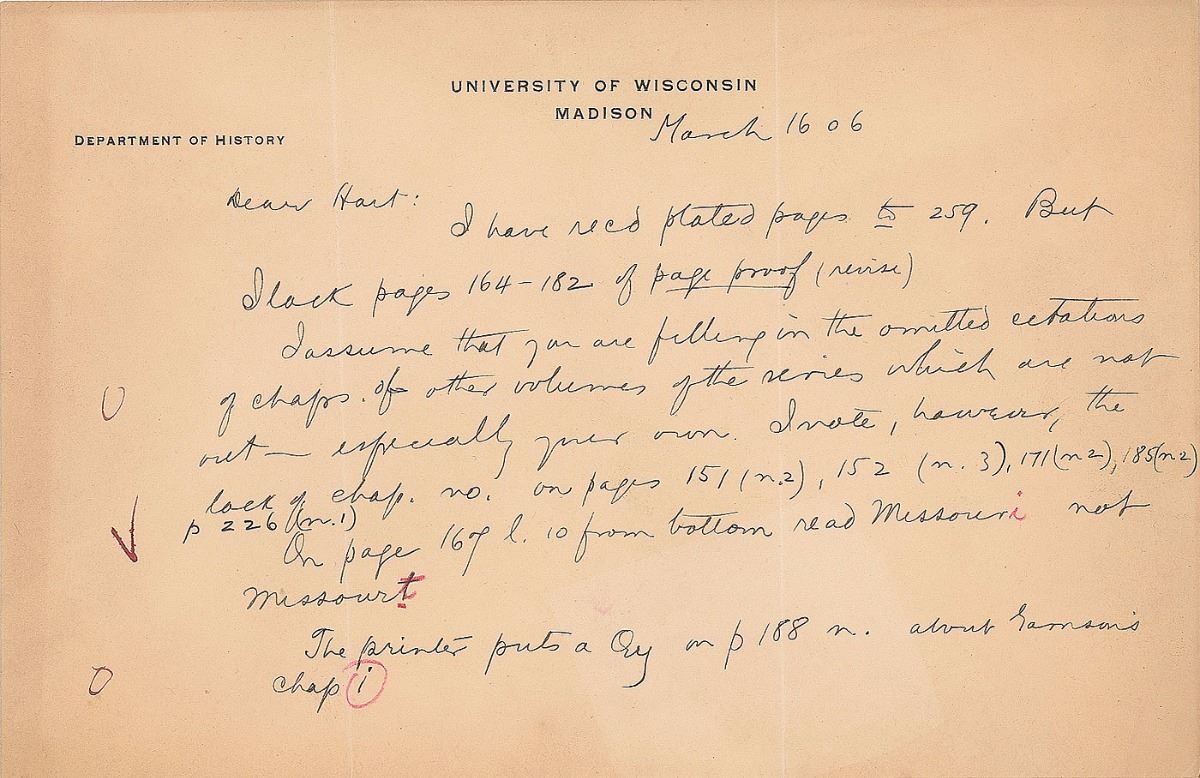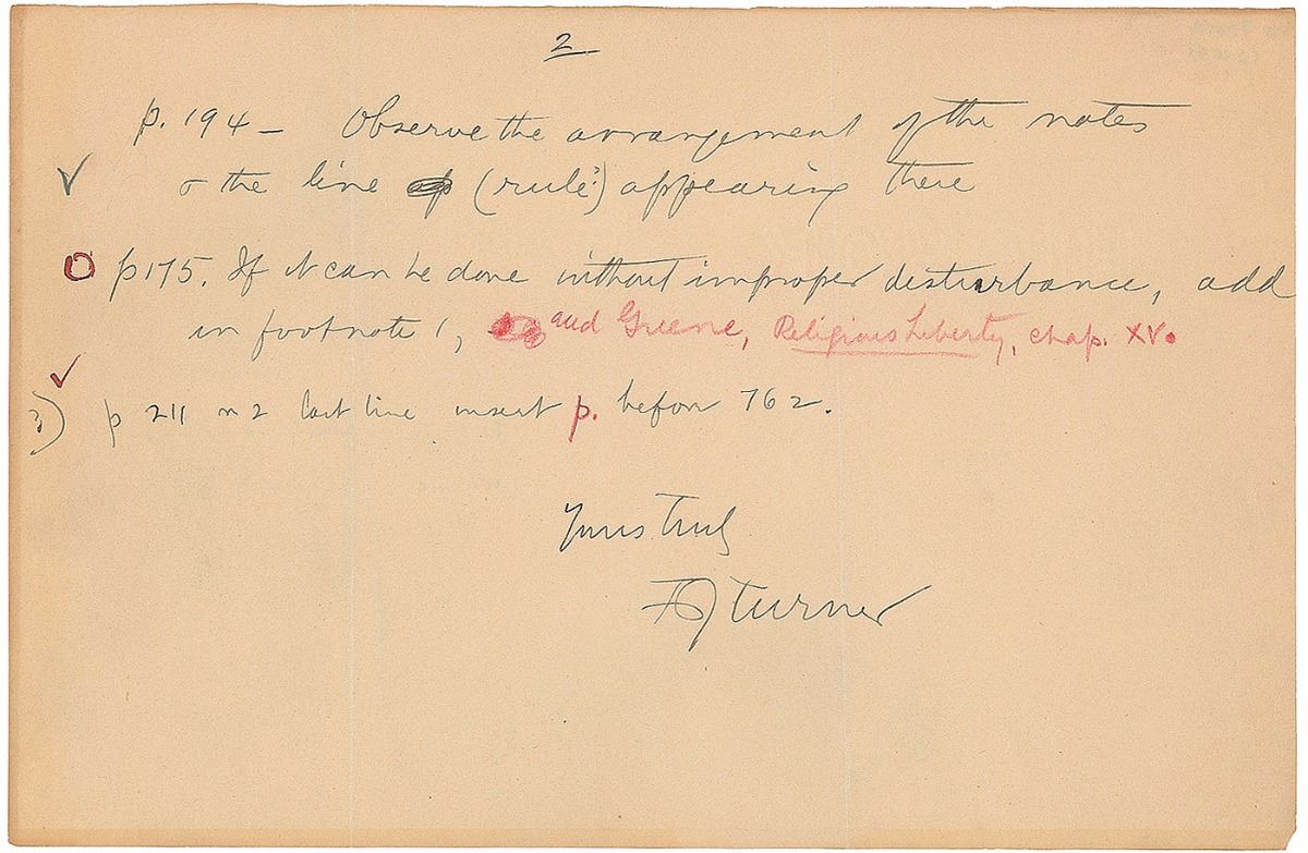 American historian in the early 20th century (1861–1932) best remembered for his essay The Significance of the Frontier in American History; his acclaimed Frontier Thesis argued that the moving western frontier shaped American democracy and the American character from the colonial era until 1890. Set of three ALSs, two signed “F. J. Turner” and “F. J. T.,” five pages in total, each 8.5 x 5.5, two letters are written on University of Wisconsin, Madison letterhead and dated in March of 1906. All letters are addressed to Harvard Professor Albert Bushnell Hart, and concern the publication of Rise of the New West, Turner’s monograph installment in the upcoming American Nation series. The first, dated March 5, in part: “I find in my proof this morning that the page proof for New England and for the Middle region & South is already plated…I desire to remind you of the corrections sent into you and which arrived too late for the page proof.” The second, unsigned, dated March 16, in part: “I assume that you are filling in the omitted citations of chaps. of other volumes of the series which are not out—especially your own.” The third, undated, in part: “Change plated page 109 line 1 Hull to Hall. Do not forget Virgin—not Virginia.” Turner makes several notes and marks in red ink and pencil. In overall fine condition.