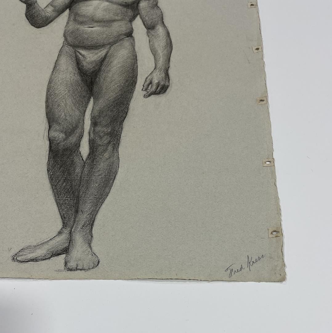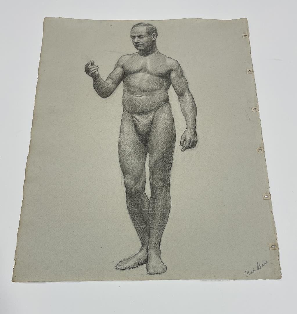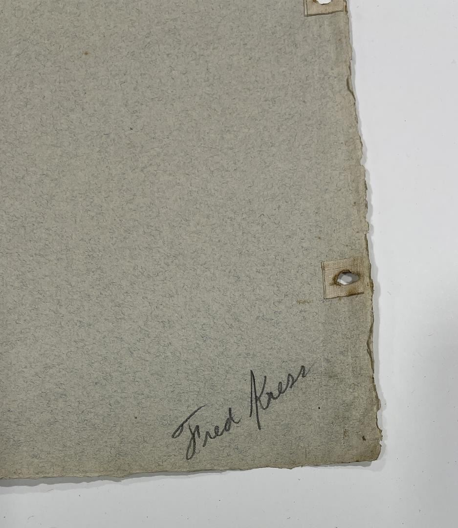 Graphite on paper. 18.75" by 24.75". Circa 1920s. Born in Pittsburgh, PA on Jan. 7, 1888, the son of artist Carl Victor Kress. Fred Kress spent his childhood in Pittsburgh and high school years in Independence, MO. His arrival with his family in San Francisco was a few months before the disaster of 1906. While working with his father as a sign and scenery painter, he studied at the Institute of Art. During his five years at that school he also studied privately with local artists Maynard Dixon, C. Chapel Judson, and Emil Grebs. In 1912 Kress began making painting excursions into the Big Sur area, Yosemite, Lake Tahoe, and Marin County when not working in the paint department of Foster & Kleiser (billboards), a position he held for 42 years. He exhibited with the San Francisco Art Ass'n until 1920 and after that time painted strictly for pleasure and was not known to have exhibited or sold any of his paintings. A resident of San Francisco until 1962, his last years were spent in Santa Rosa, CA where he died on Aug. 10, 1970. Using a bright palette, he painted small, realistic landscapes of northern California. Exh: San Francisco Art Association, 1913-16.