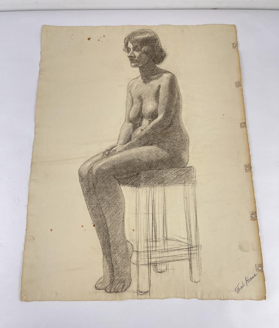 Graphite on paper. 18.5" by 24". Circa 1920s. Born in Pittsburgh, PA on Jan. 7, 1888, the son of artist Carl Victor Kress. Fred Kress spent his childhood in Pittsburgh and high school years in Independence, MO. His arrival with his family in San Francisco was a few months before the disaster of 1906. While working with his father as a sign and scenery painter, he studied at the Institute of Art. During his five years at that school he also studied privately with local artists Maynard Dixon, C. Chapel Judson, and Emil Grebs. In 1912 Kress began making painting excursions into the Big Sur area, Yosemite, Lake Tahoe, and Marin County when not working in the paint department of Foster & Kleiser (billboards), a position he held for 42 years. He exhibited with the San Francisco Art Ass'n until 1920 and after that time painted strictly for pleasure and was not known to have exhibited or sold any of his paintings. A resident of San Francisco until 1962, his last years were spent in Santa Rosa, CA where he died on Aug. 10, 1970. Using a bright palette, he painted small, realistic landscapes of northern California. Exh: San Francisco Art Association, 1913-16.