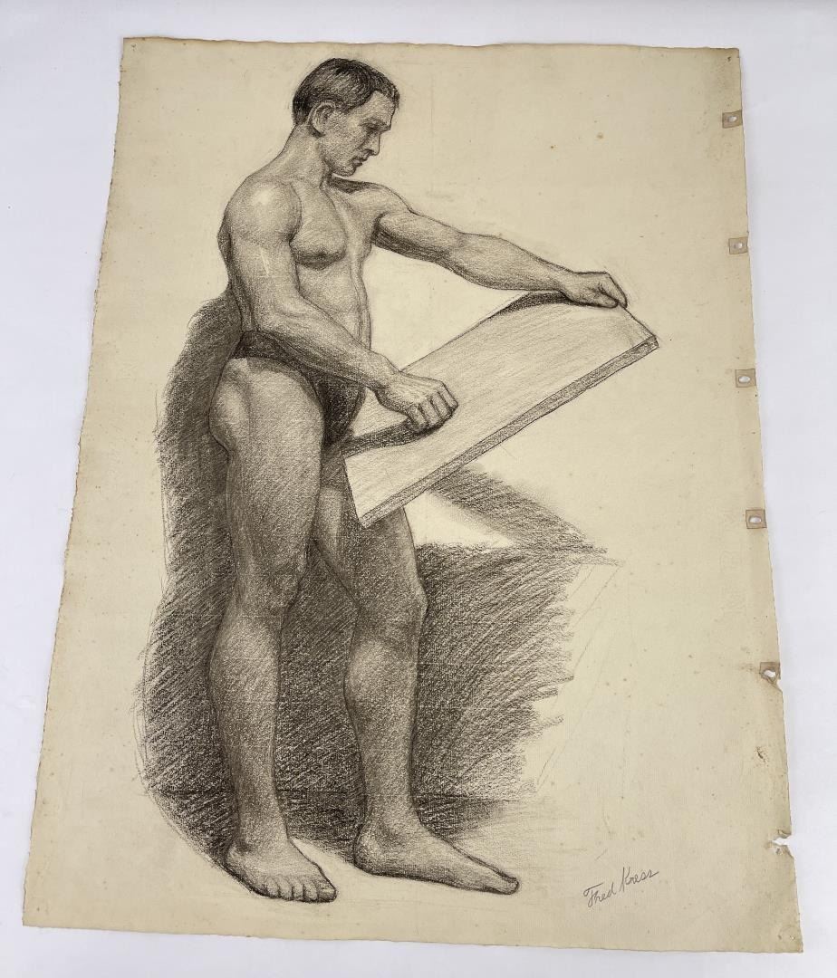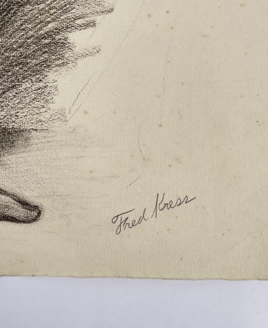 Graphite on paper. 18.75" by 24.75". Circa 1920s. Born in Pittsburgh, PA on Jan. 7, 1888, the son of artist Carl Victor Kress. Fred Kress spent his childhood in Pittsburgh and high school years in Independence, MO. His arrival with his family in San Francisco was a few months before the disaster of 1906. While working with his father as a sign and scenery painter, he studied at the Institute of Art. During his five years at that school he also studied privately with local artists Maynard Dixon, C. Chapel Judson, and Emil Grebs. In 1912 Kress began making painting excursions into the Big Sur area, Yosemite, Lake Tahoe, and Marin County when not working in the paint department of Foster & Kleiser (billboards), a position he held for 42 years. He exhibited with the San Francisco Art Ass'n until 1920 and after that time painted strictly for pleasure and was not known to have exhibited or sold any of his paintings. A resident of San Francisco until 1962, his last years were spent in Santa Rosa, CA where he died on Aug. 10, 1970. Using a bright palette, he painted small, realistic landscapes of northern California. Exh: San Francisco Art Association, 1913-16.