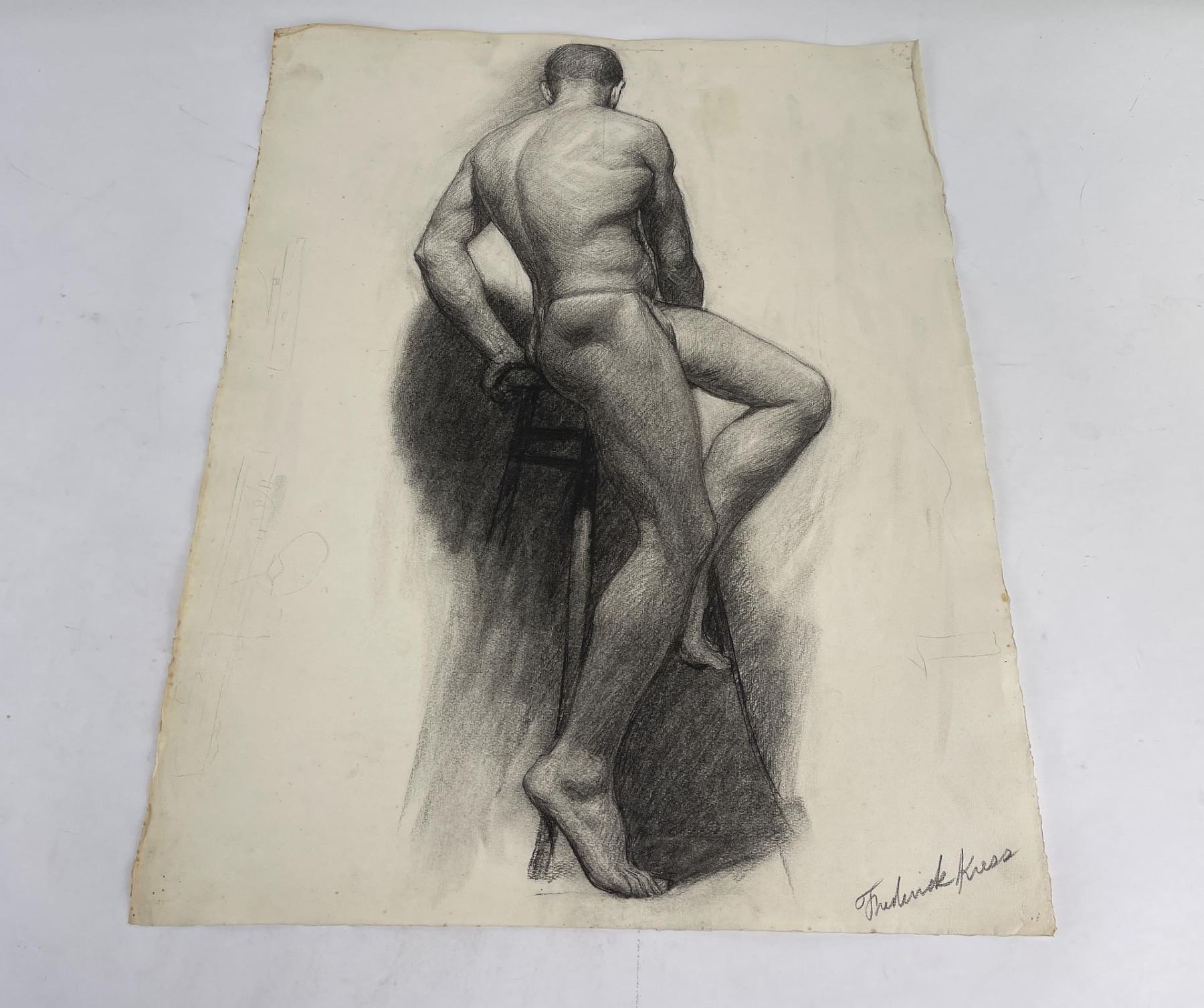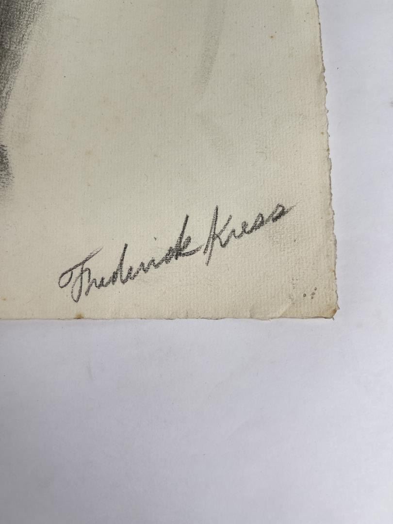Graphite on paper. 19" by 24.5". Circa 1920s. Born in Pittsburgh, PA on Jan. 7, 1888, the son of artist Carl Victor Kress. Fred Kress spent his childhood in Pittsburgh and high school years in Independence, MO. His arrival with his family in San Francisco was a few months before the disaster of 1906. While working with his father as a sign and scenery painter, he studied at the Institute of Art. During his five years at that school he also studied privately with local artists Maynard Dixon, C. Chapel Judson, and Emil Grebs. In 1912 Kress began making painting excursions into the Big Sur area, Yosemite, Lake Tahoe, and Marin County when not working in the paint department of Foster & Kleiser (billboards), a position he held for 42 years. He exhibited with the San Francisco Art Ass'n until 1920 and after that time painted strictly for pleasure and was not known to have exhibited or sold any of his paintings. A resident of San Francisco until 1962, his last years were spent in Santa Rosa, CA where he died on Aug. 10, 1970. Using a bright palette, he painted small, realistic landscapes of northern California. Exh: San Francisco Art Association, 1913-16.