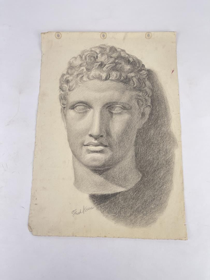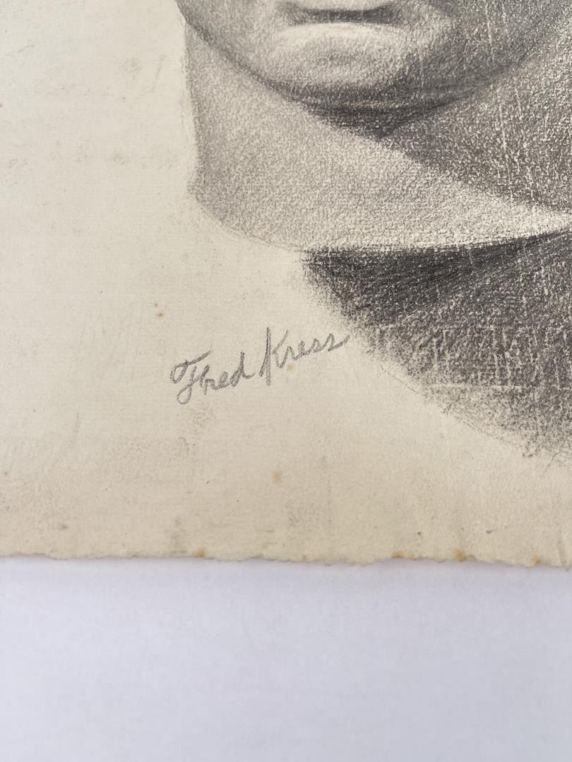 Graphite on paper. 12" by 17.25". Circa 1920s. Born in Pittsburgh, PA on Jan. 7, 1888, the son of artist Carl Victor Kress. Fred Kress spent his childhood in Pittsburgh and high school years in Independence, MO. His arrival with his family in San Francisco was a few months before the disaster of 1906. While working with his father as a sign and scenery painter, he studied at the Institute of Art. During his five years at that school he also studied privately with local artists Maynard Dixon, C. Chapel Judson, and Emil Grebs. In 1912 Kress began making painting excursions into the Big Sur area, Yosemite, Lake Tahoe, and Marin County when not working in the paint department of Foster & Kleiser (billboards), a position he held for 42 years. He exhibited with the San Francisco Art Ass'n until 1920 and after that time painted strictly for pleasure and was not known to have exhibited or sold any of his paintings. A resident of San Francisco until 1962, his last years were spent in Santa Rosa, CA where he died on Aug. 10, 1970. Using a bright palette, he painted small, realistic landscapes of northern California. Exh: San Francisco Art Association, 1913-16.
