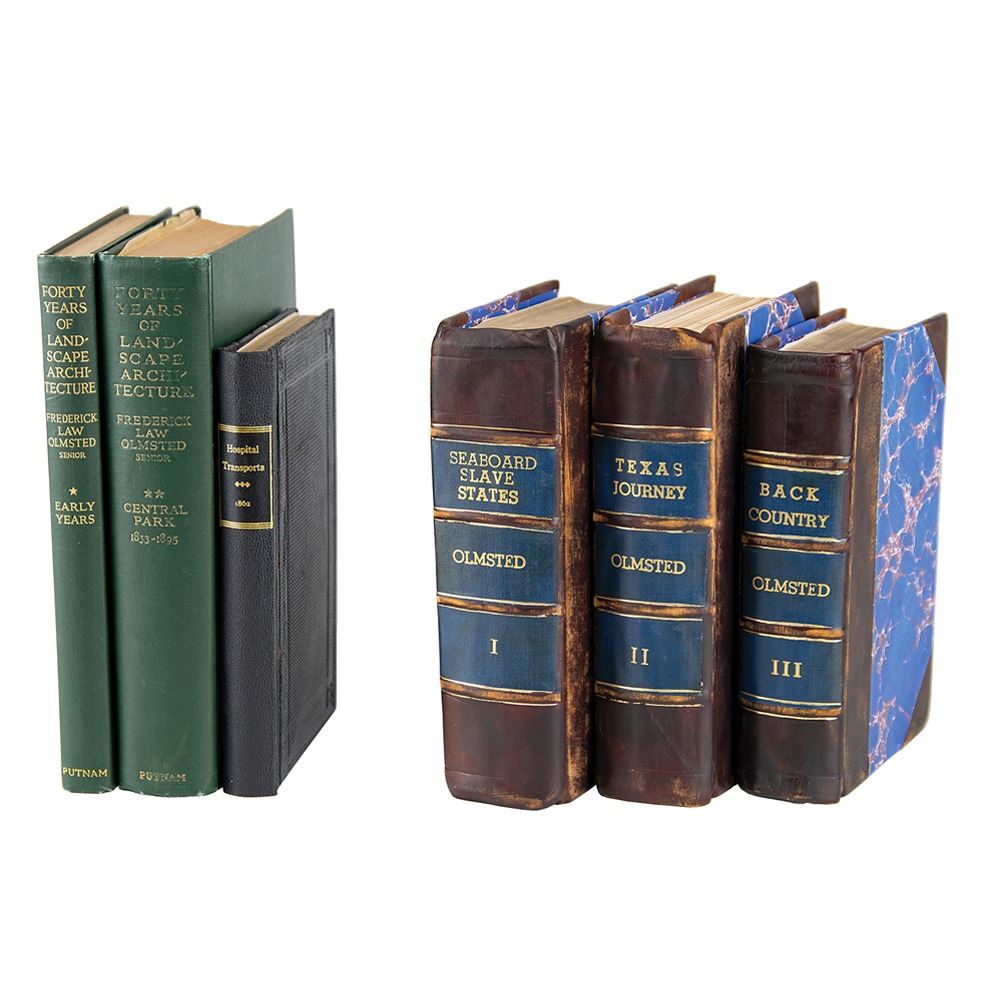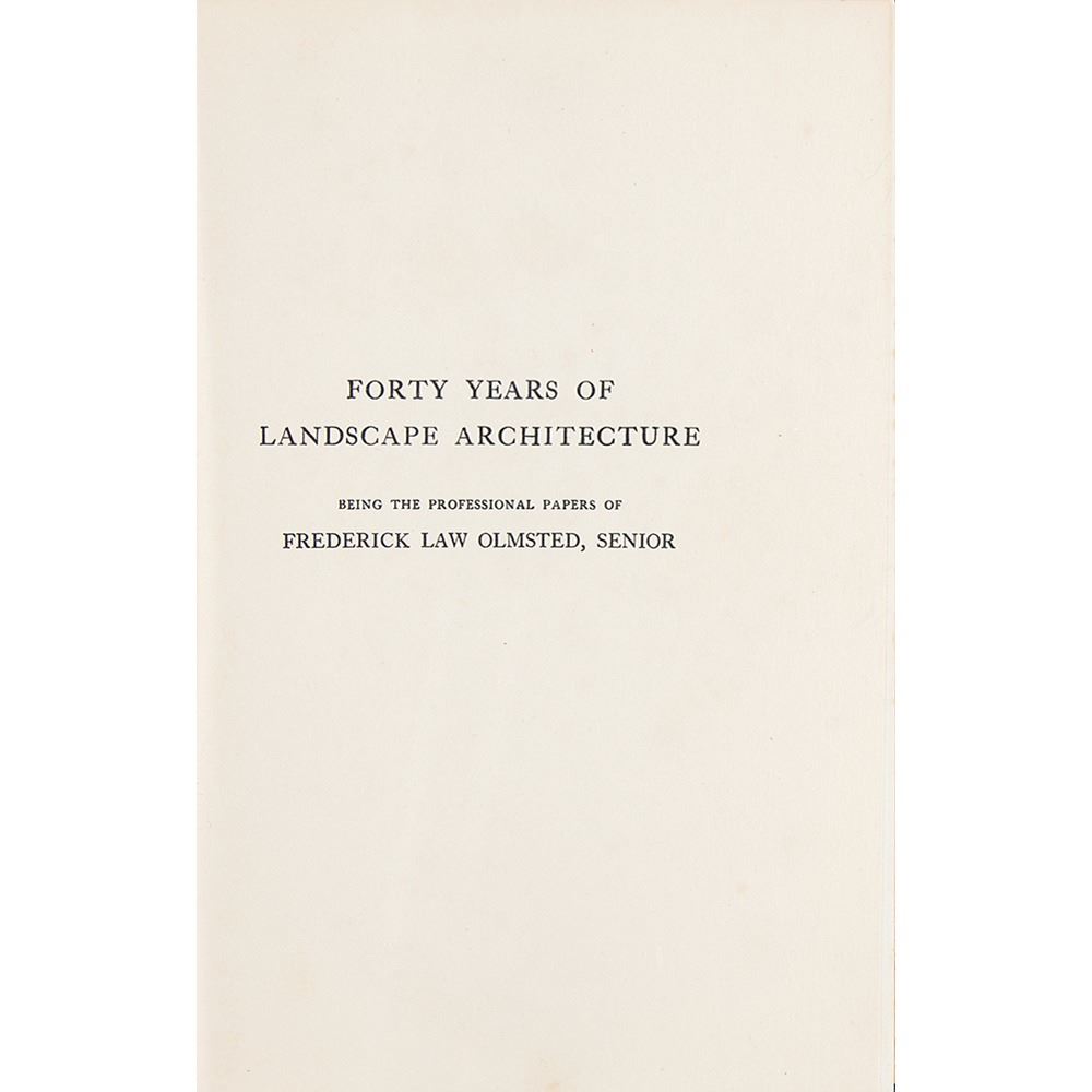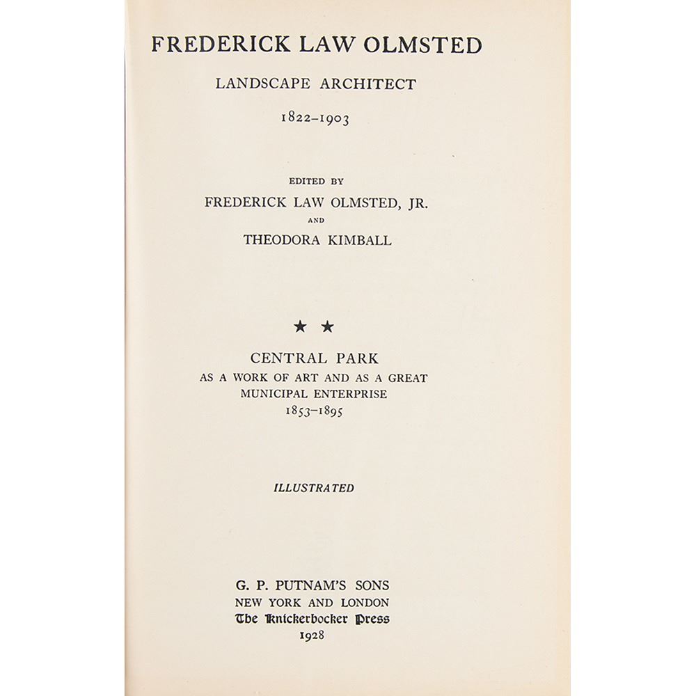 Two-volume set entitled Forty Years of Landscape Architecture: Being the Professional Papers of Frederick Law Olmsted, Senior,’ containing ‘Early Years and Experiences Together with Biographical Notes’ and ‘Central Park as a Work of Art and as a Great Municipal Enterprise,’ both published in New York by G. P. Putnam’s Sons in 1922 and 1928, respectively. Both hardcover with dark green boards and spines titled in gilt, 6 x 8.75, 131 pages and 575 pages, with the second volume concluding with an impressive panoramic map of Central Park with an overlay key map. Book condition: VG/None, with rubbing to gilt title of the second volume and some creasing to the fold-out map and its onionskin overlay.