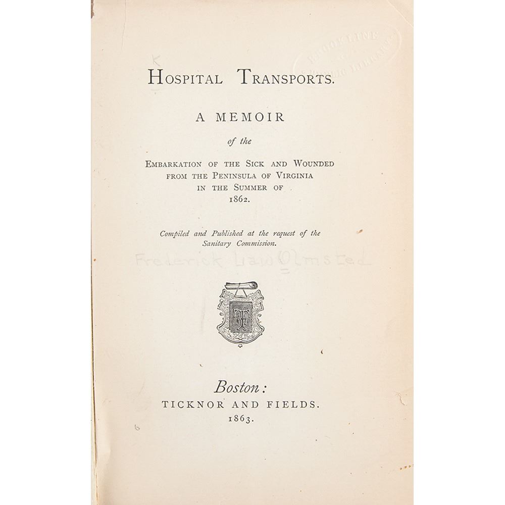 Hospital Transports: A Memoir of the Embarkation of the Sick and Wounded from the Peninsula of Virginia in the Summer of 1862. Boston: Ticknor and Fields, 1863. Pebbled hardcover with affixed title label to spine, 4.75 x 7.25, 167 pages. Book condition: VG+/None, with rebacked binding and small ex-library blindstamp to title page.