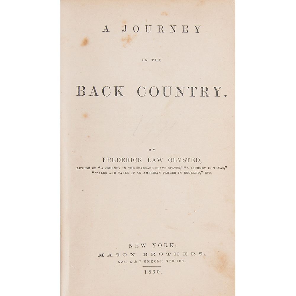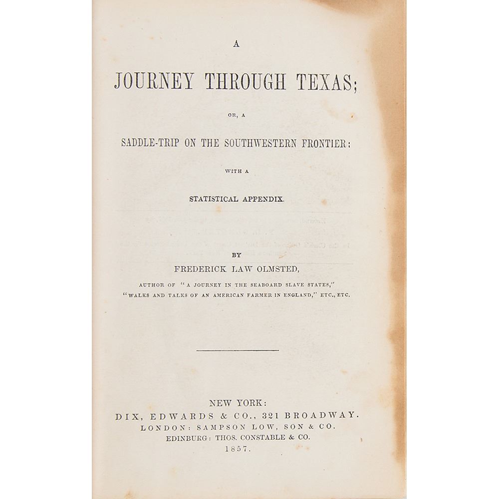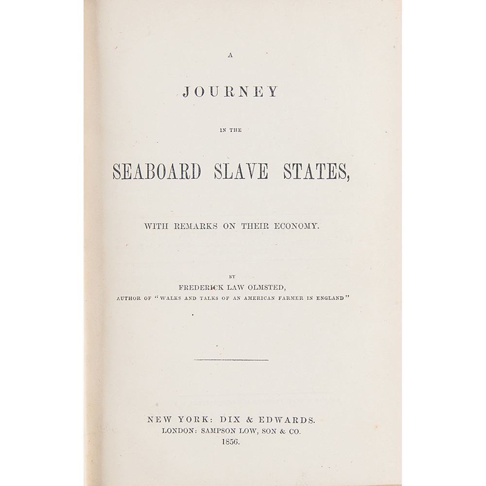 A three-volume set containing A Journey in the Seaboard Slave States, published in New York by Dix & Edwards in 1856; A Journey through Texas, published in New York by Dix, Edwards & Co. in 1857; and A Journey in the Back Country, published in New York by Mason Brothers in 1860. Each hardcover, approximately 5 x 7.25, bound with three-quarter leather and marbled boards with raised bands and gilt titling to spine; accompanied by a custom slipcase and a folded “Map of the Cotton Kingdom and Its Dependencies.” Book condition: VG-/None, with wear and rubbing to leather, and scattered foxing and staining to textblocks.