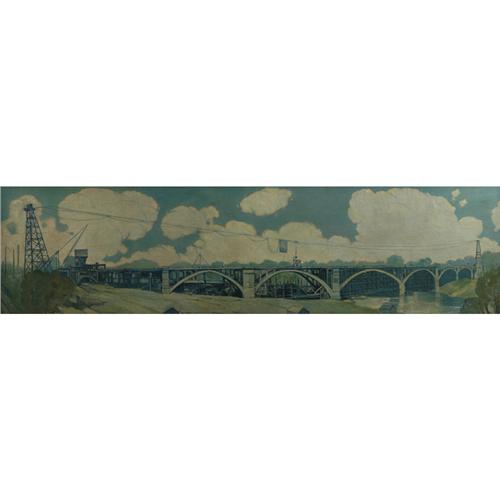 Frederick Lincoln Stoddard (American, died 1940), Bridge Construction (Mural), oil/canvas laid down on board,23 x 87.Stoddard studied in Paris and at the St.Louis School of Fine Art.He was a member of the North Shore Art Association and the Salmagundi Clu