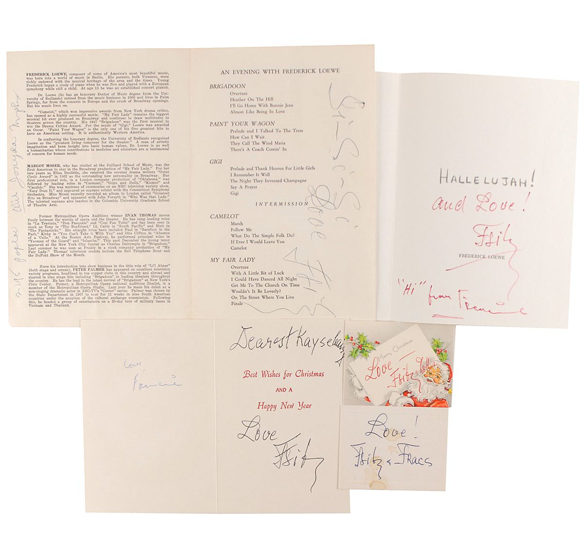 Five items: one program for An Evening with Frederick Loewe, 6 x 9, University of Redlands, March 2, 1968, signed inside, “Si-Si-Si, Love, Fritz”; one Christmas themed notecard, 3.5 x 2.75, signed in red felt tip, “Love—Fritz & Lothian”; one Christmas card, 4.25 x 6.5, signed and inscribed inside; another Christmas card depicting an organist, 6 x 8, signed inside in red felt tip; and one ballpoint signature, “Love! Fritz & Fracs,” on an off-white 3.5 x 2.75 card. Central horizontal and vertical folds to the program, and coffee stains to the card, otherwise fine condition. Accompanied by an unsigned invitation to a party Loewe was hosting.
